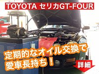 TOYOTA セリカGT-FOUR エンジンオイル+オイルフィルター交換です。 今回のセリカは、オイルゲージ部からホースを入れて古いオイル抜き取る【上抜き方式】で交換させていただきました。 オイル抜き取り中に安全点検も行います! 古いオイルが抜き終わったら、リフトアップしてオイルフィルターを交...