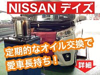 NISSAN デイズ エンジンオイル+オイルフィルター交換のご紹介です。 今回のデイズは、オイルゲージ部からホースを入れて古いオイル抜き取る【上抜き方式】で交換させていただきました。 オイル抜き取り中に安全点検も行います! 古いオイルが抜き終わったら、リフトアップしてオイルフィルターを交...