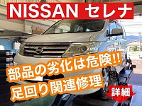 NISSAN セレナ 足回り関連部品交換修理のご紹介です。 今回のセレナは当初アライメント調整のご依頼で入庫となったのですが、タイロッドエンドブーツのヒビ割れを発見しました。 この段階であればブーツ交換だけですみますし、ブーツ交換後はアライメントも崩れてしまうのでこのタイミングで交換を...
