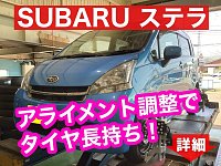 SUBARU ステラ アライメント調整作業のご紹介です。 今回のステラは夏タイヤを新品に交換するに伴い、タイヤの外側の減りがかなり強く出ていたのでアライメント調整も合わせて実施する事となりました。 ステラは前輪のトー角のみ調整となりますが、外ベリの原因として前輪のキャンバー角があやしい...