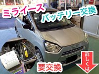 ミライースのバッテリー交換を 行わせていただきました。 タイヤ交換時に無料安全点検で バッテリーを点検してみると「要交換」! 製造年数は2021年なので2年以上、 3年未満の使用でした。バッテリートラブル 回避のため、予防交換をおすすめ させていただきました。 ミライースはアイドリングスト...