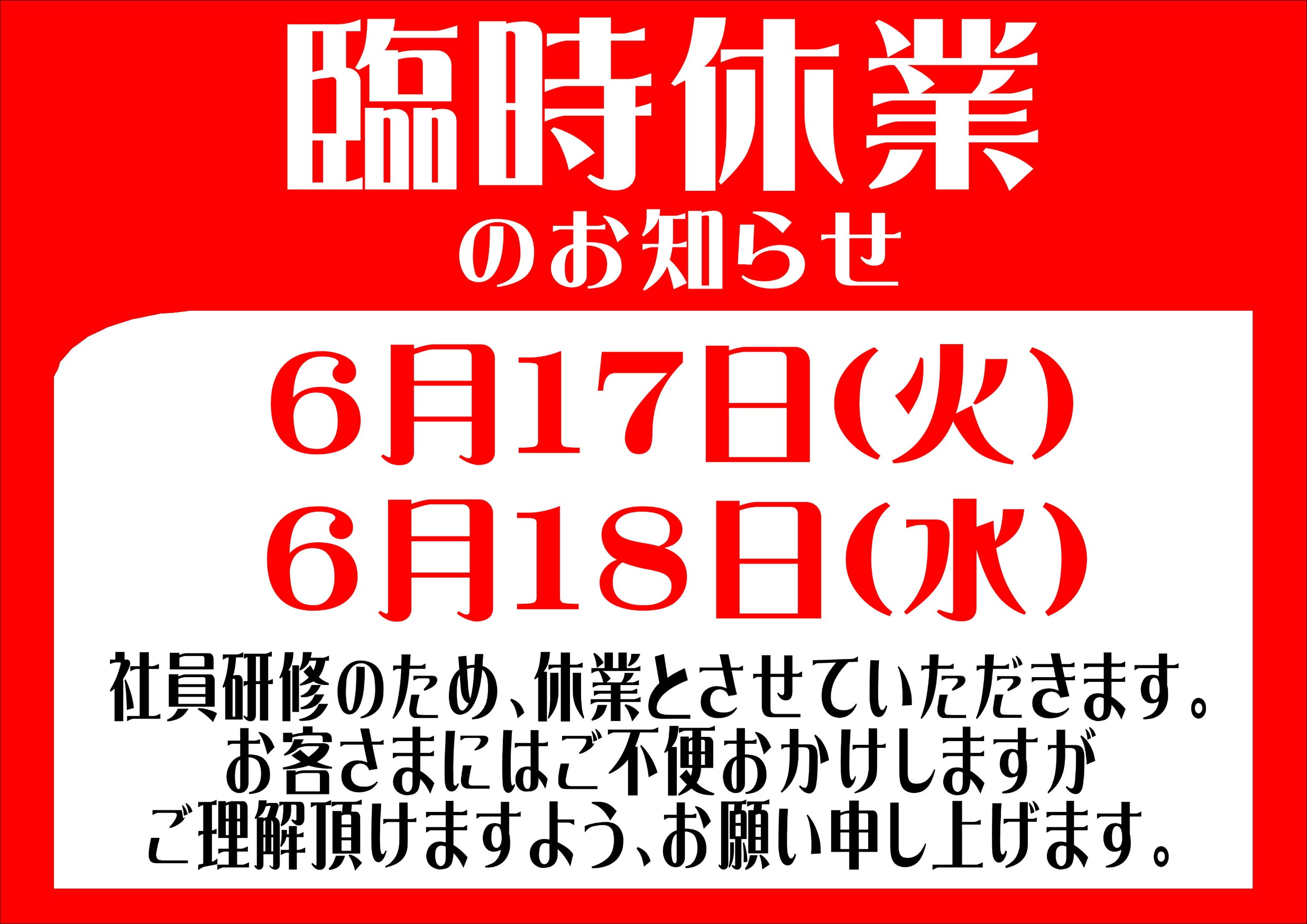 17・18日 臨時休業のお知らせ ポスト 2025年6月16日 いつも当店をご利用いただき誠にありがとうございます ~ 営業日程のご案内 ~ 6月17日(火)・18日(水)は 社員研修の為、臨時休業となります ご不便をおかけしますが、ご理解頂けますようよろしくお願いいたします カテゴリ:お知らせ