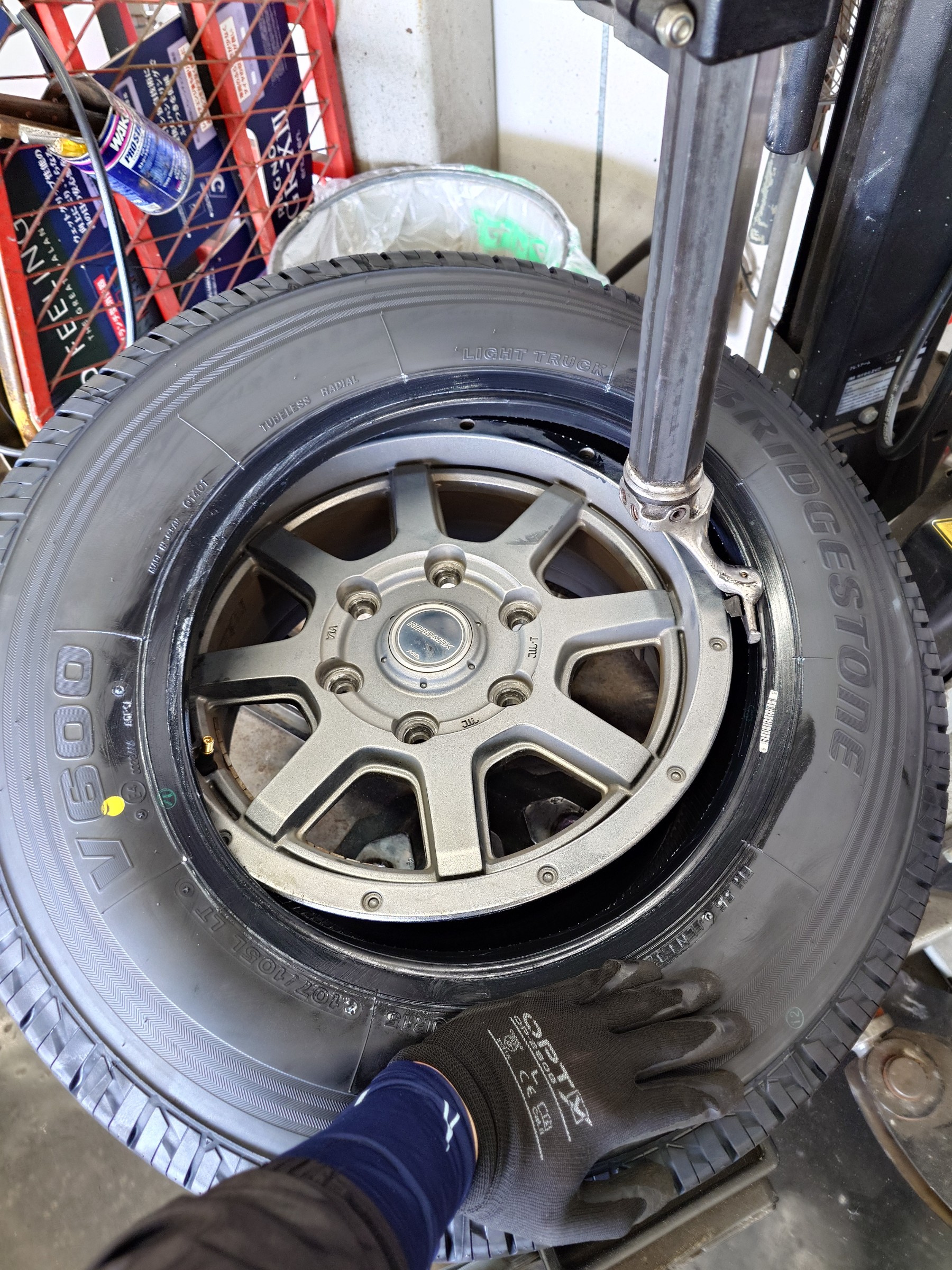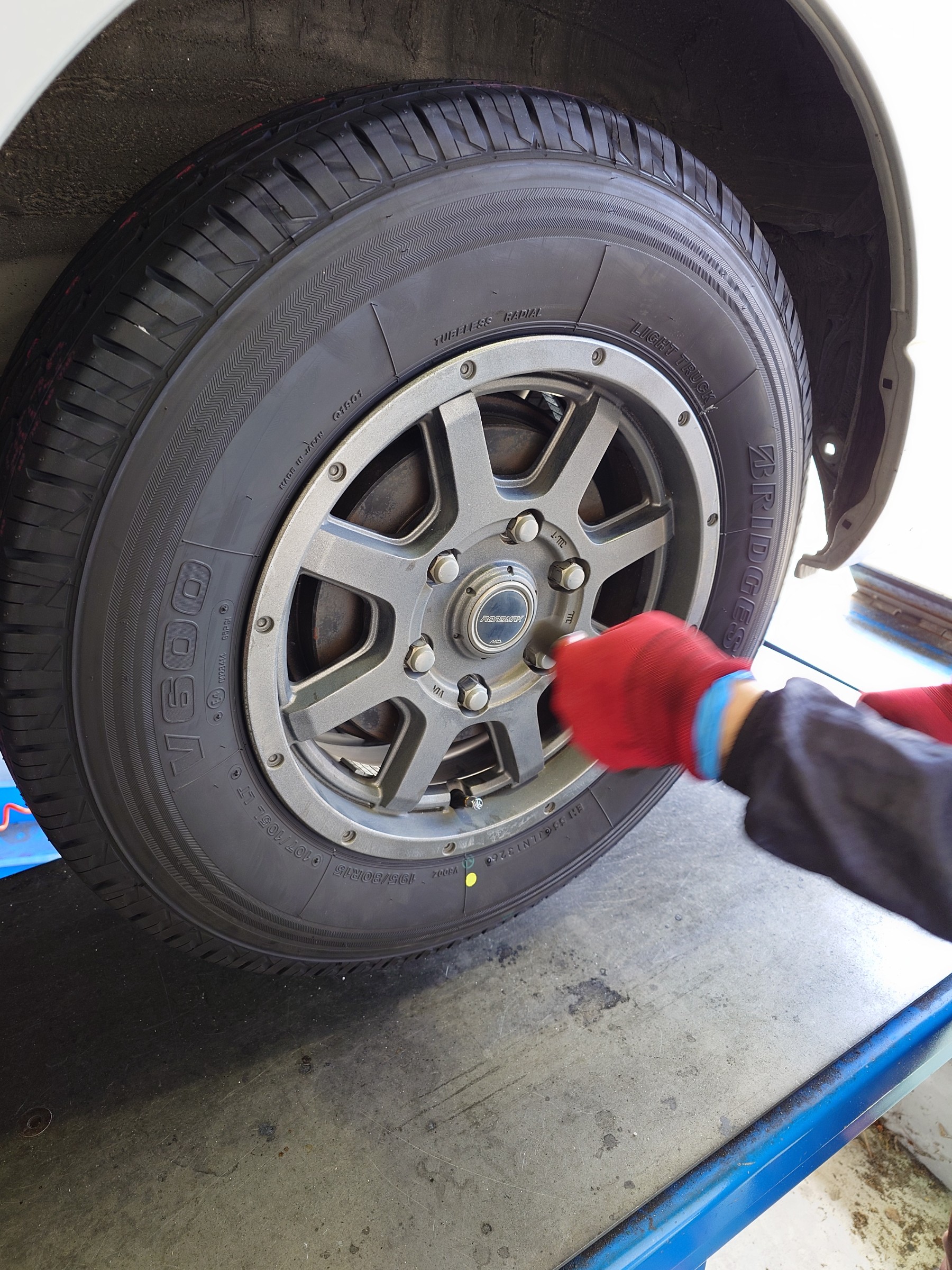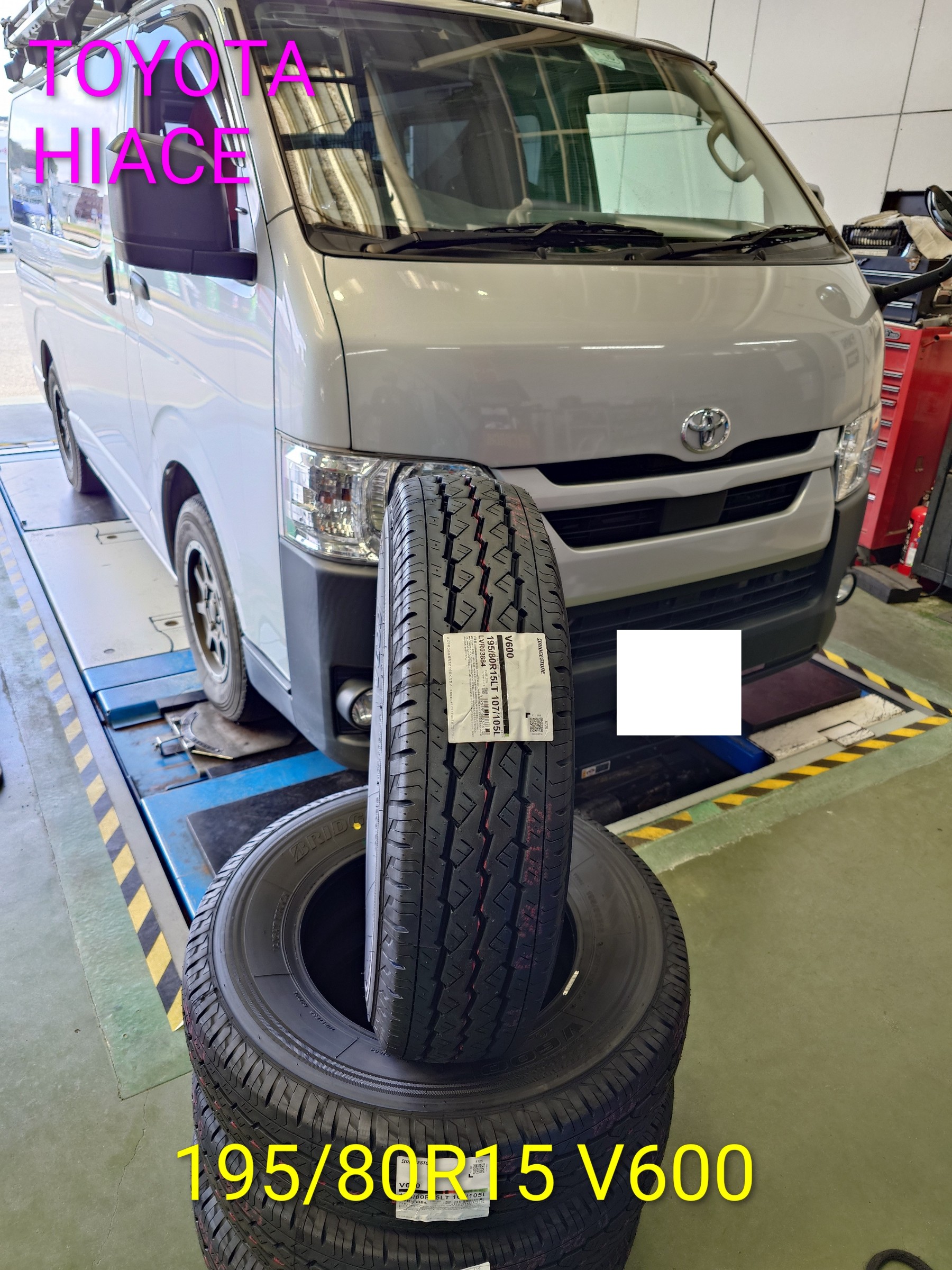トヨタ ハイエース タイヤ交換+アライメント調整 195/80R15 107/105 V600