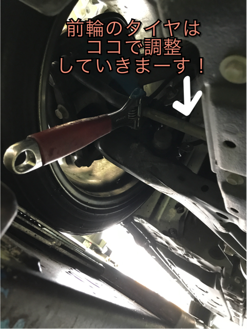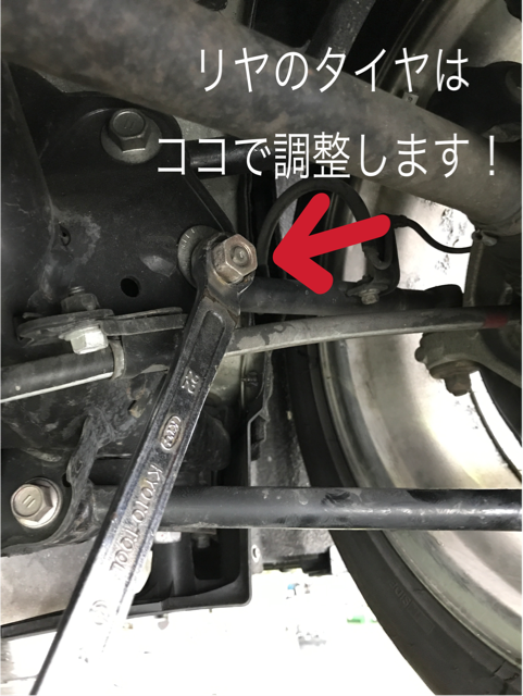 ダウンサス取付後は、やはりタイヤの取付角度が、左右でもバラバラの状態でした。