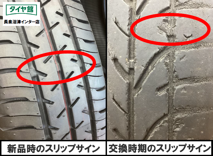 この画像の右のタイヤのようにスリップサインが出ていればタイヤ交換のサインです。