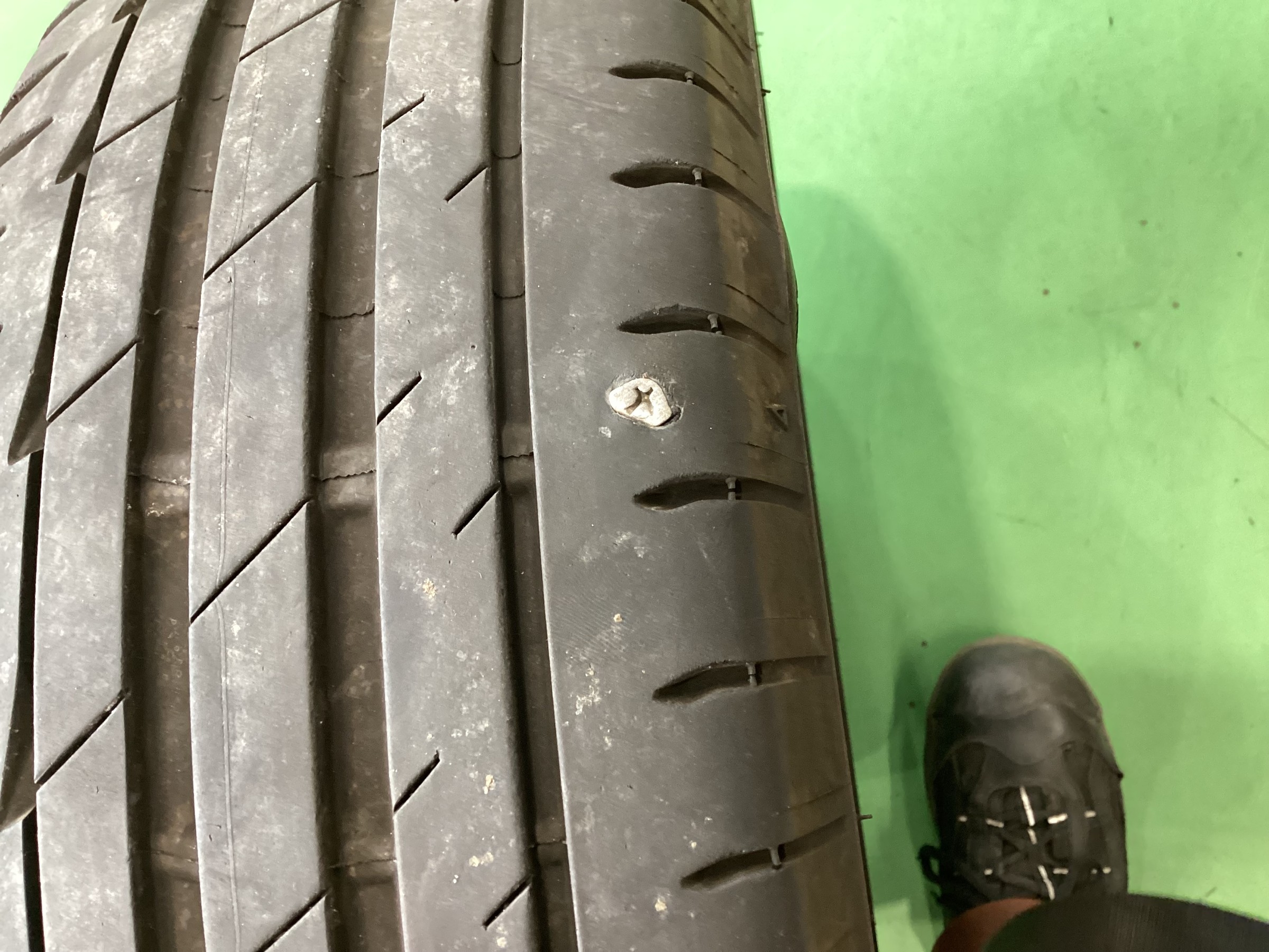 ご自宅の駐車場でタイヤにネジが刺さっているの発見されてご連絡をいただきました。