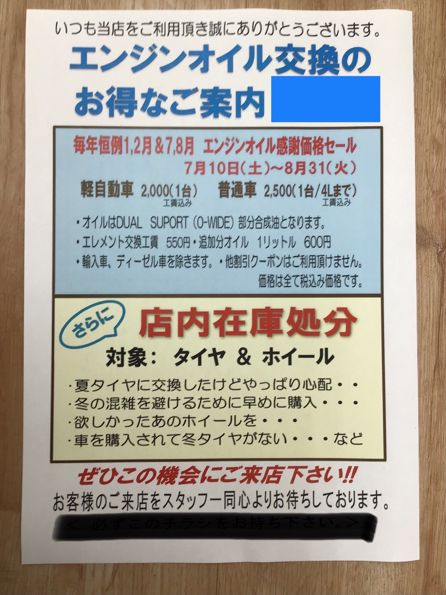 エンジンオイル交換キャンペーン ポスト 2021年7月9日 本日は、エンジンオイル交換キャンペーン のご案内です。 7/10(土)~8/31(火)まで エンジンオイルの 感謝価格セールを実施いたします! そろそろオイル交換時期の方や いつ交換したか分からず、不安な方は この機会にいかがでしょうか? (使用オイルは当店指定オイルになります) ご来店お待ちしております。 担当:スタッフ一同