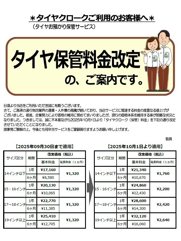 【重要】タイヤクローク 料金改定のご案内 2025年10月1日 2025年10月1日より お客さまには大変ご迷惑をお掛けすることと なりますが、何卒ご理解いただくとともに、 今後ともご愛顧を賜りますようお願い申し上げます
