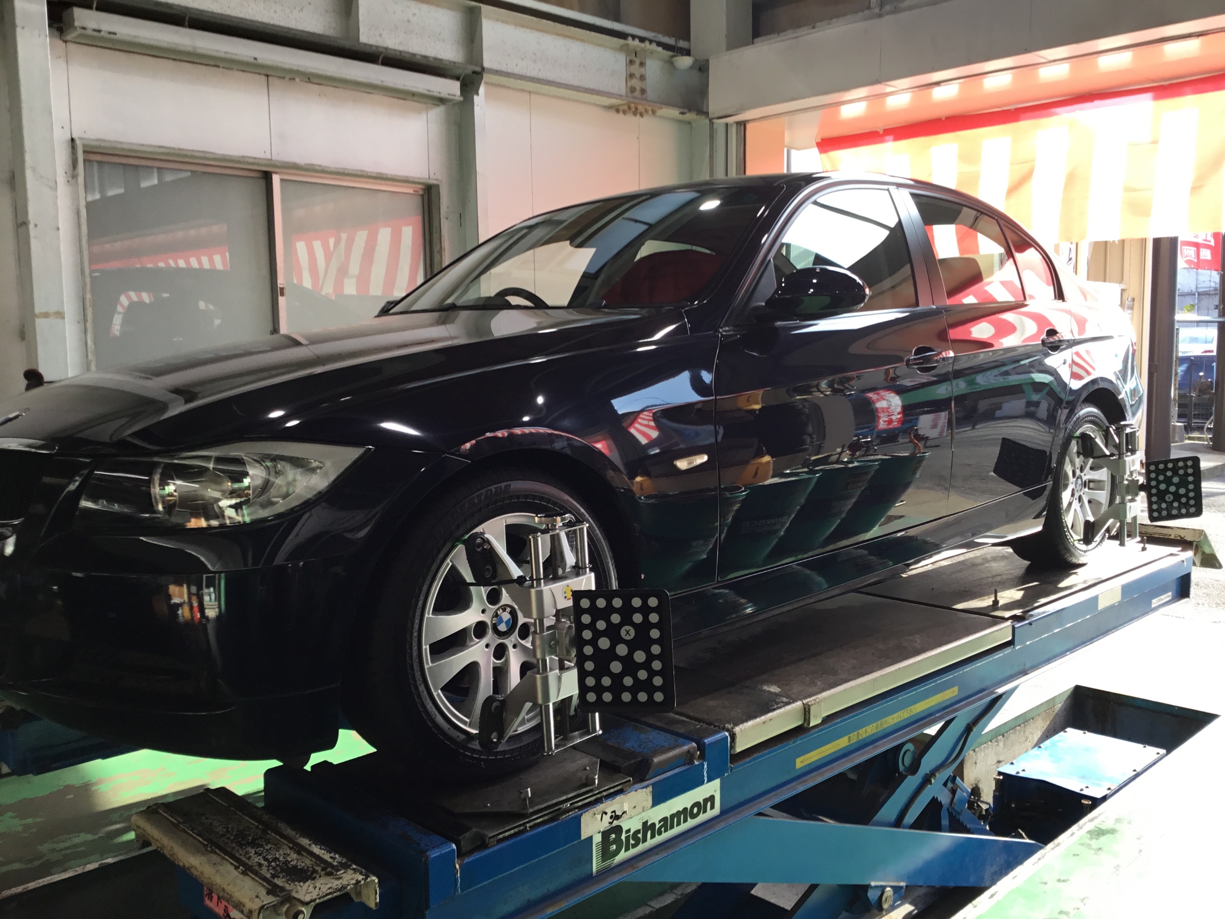 先日、BMWの3シリーズでご来店のお客様にタイヤ交換とアライメント調整を実施させて頂きました。