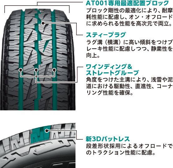 「DUELER A/T 001」は、専用の最適配置ブロック及びコンパウンドを採用することで、