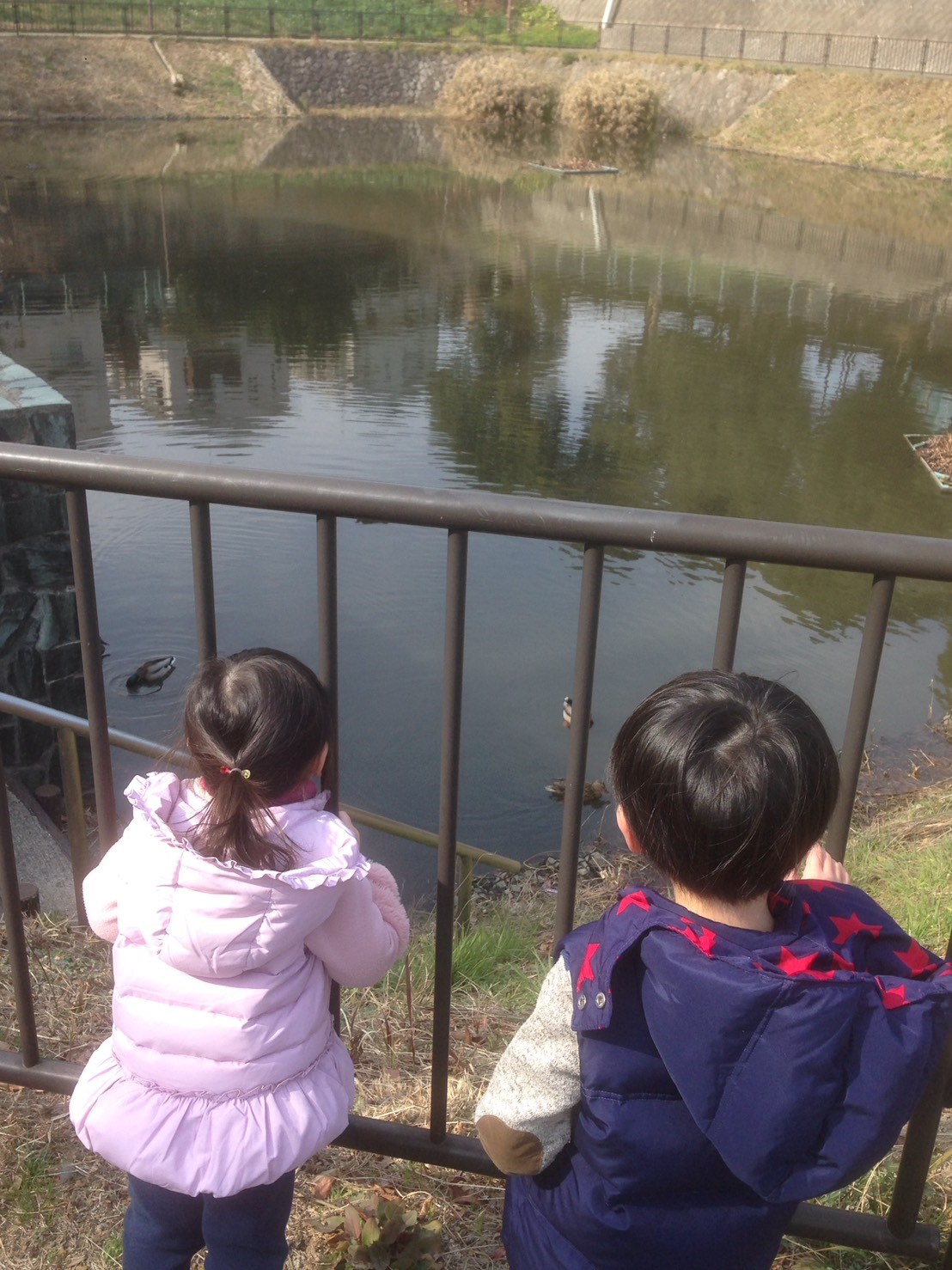 公園の鴨 ポスト 2018年2月26日 近所の公園にある池に冬になると鴨がやってくるんです。 公園で遊んで、鴨を見るのが子供達の楽しみ♪ 池に何羽か写っているのがわかりますか~? 全部で10羽ぐらいいるんですが、以前は人に慣れていないのか近寄ってこなかったのに こちら側に集まって来てくれたので、子供達も喜んでいました。 最近は春らしい日も増えて、公園の散歩も心地いい季節のはじまりですね。 担当:いっぽうじ
