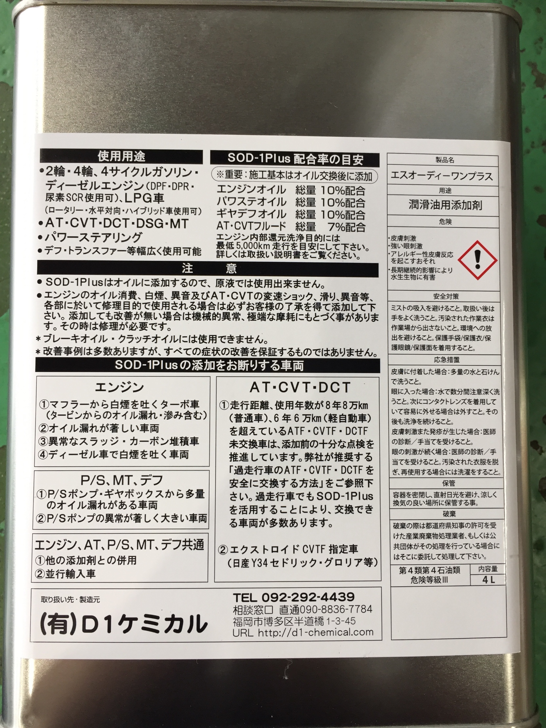 SOD-1 puls ポスト 2018年9月17日 福岡整備士振興会で認定のオイル フルード添加剤 お取り扱いスタートです エンジンオイル、デフオイル、パワステフルード、トランスミッションオイルすべてに添加できる唯一の添加剤です 整備士振興会のお墨付きもあり、レースやカスタムショップ、チューニングショップでの使用や雑誌掲載で注目の商品です カテゴリ:オイル関連 担当:新郷