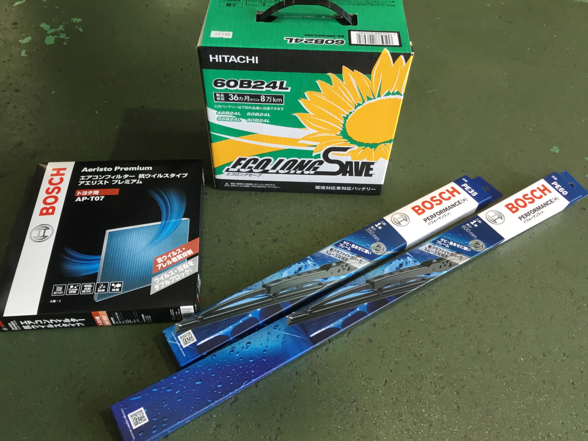 バッテリーは、充電制御車対応のエコロングセーブ(タイヤ館オリジナル)とボッシュのエアコンフィルター、ワイパーを取り付けました。