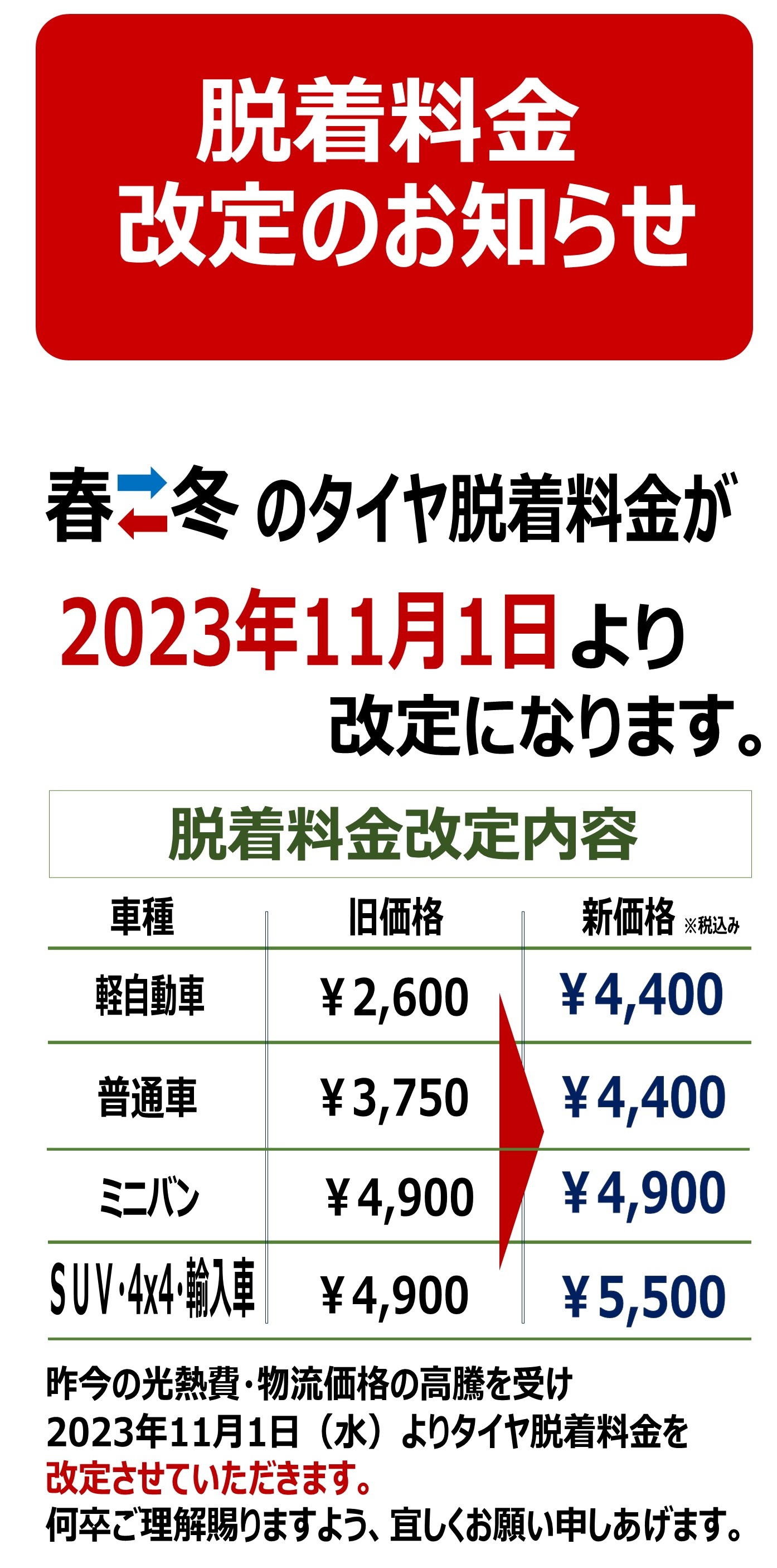 タイヤ脱着(履き替え)料金改定のお知らせ ポスト 2023年11月1日 いつもタイヤ館長岡京店をご利用いただきましてありがとうございます。 タイヤ館長岡京店では 昨今の光熱費・物流価格の高騰を受け 2023年11月1日よりタイヤ脱着(履き替え)料金を 改定させていただきます。 いつも当店をご利用いただいておりますお客様には 大変ご迷惑をおかけいたしますが、ご理解賜りますますよう お願い申し上げます。 カテゴリ:お知らせ