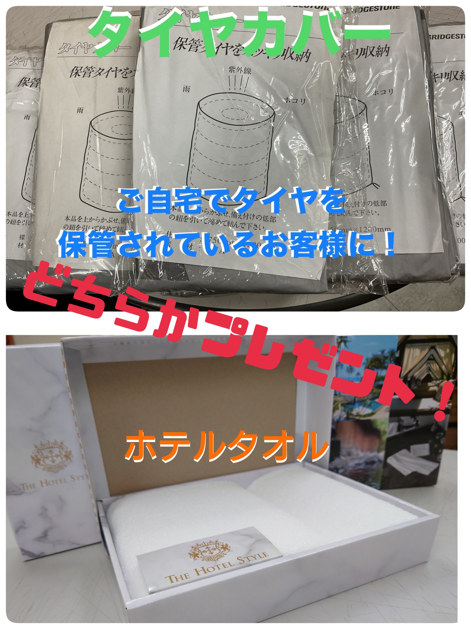 タイヤ保管カバーかホテルタオルのどちらかをプレゼントします!