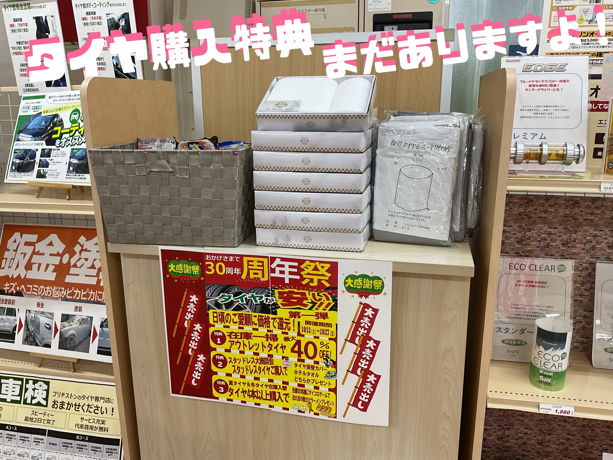 購入特典として、ホテルタオルやタイヤカバー、袋麺をお渡ししています!