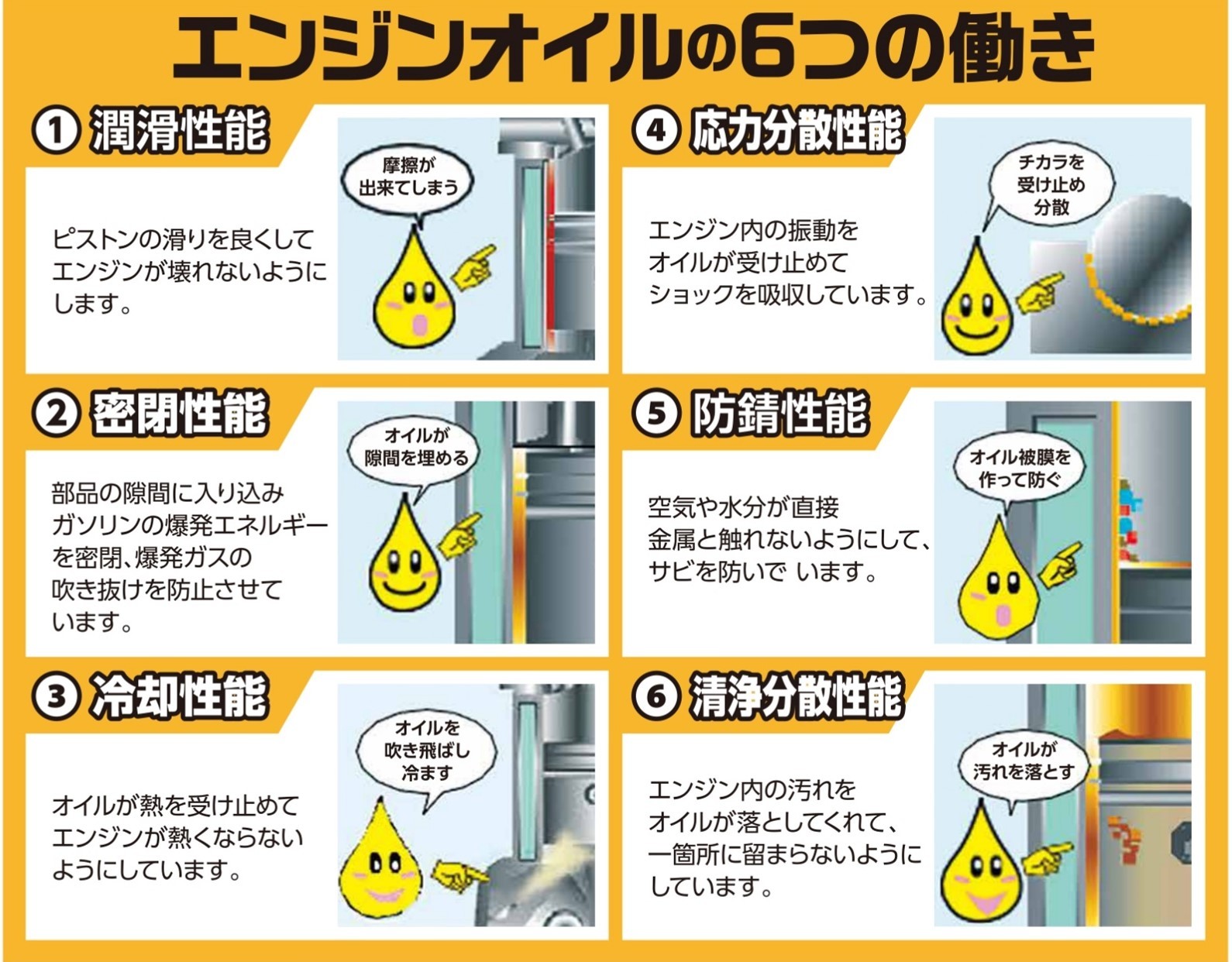このようにエンジンオイルは6つの働きをしています。