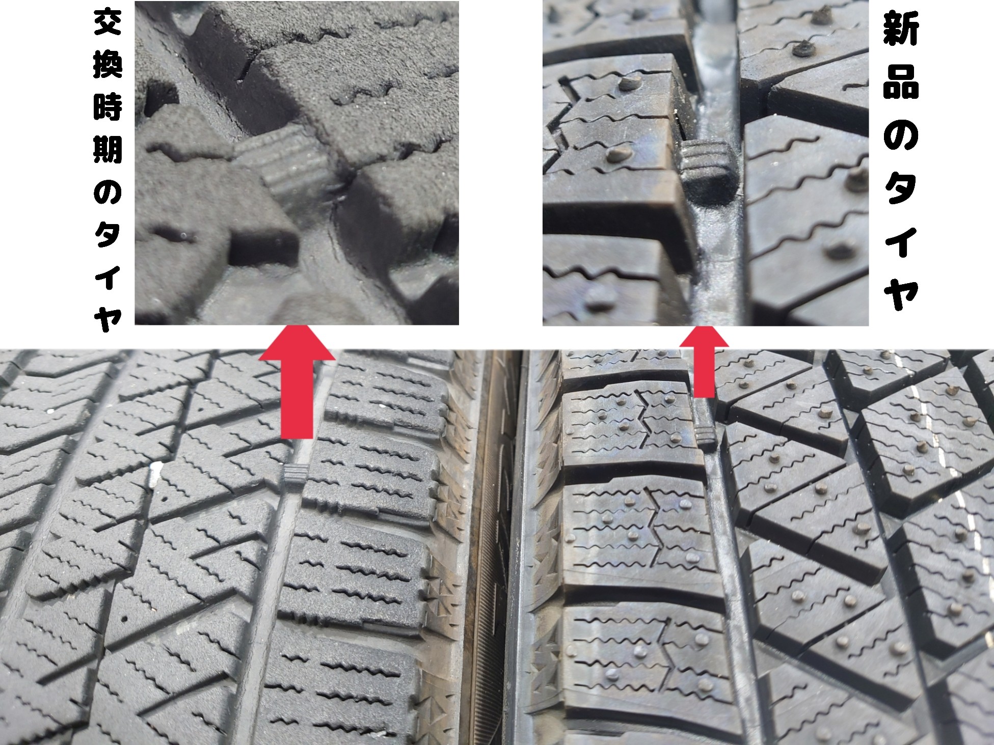 交換時期を迎えたスタッドレスタイヤを比較した画像です。