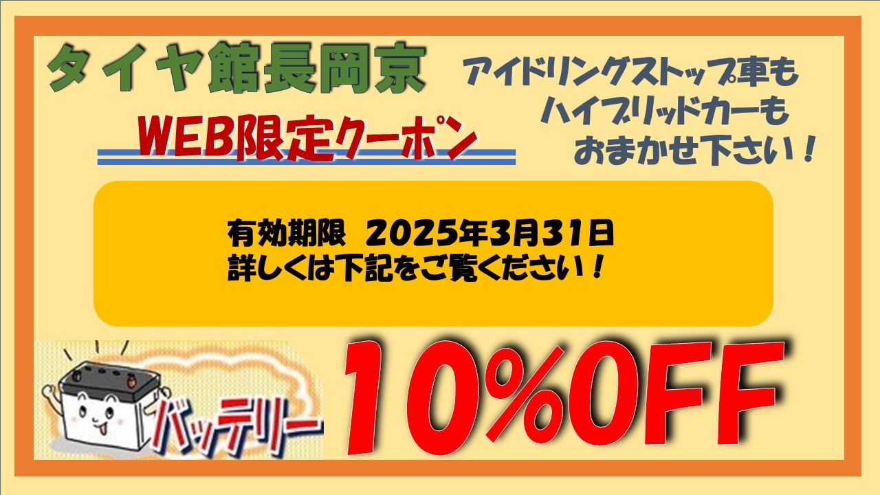 ☆クーポン券アリ☆ バッテリー交換するならタイヤ館長岡京!!