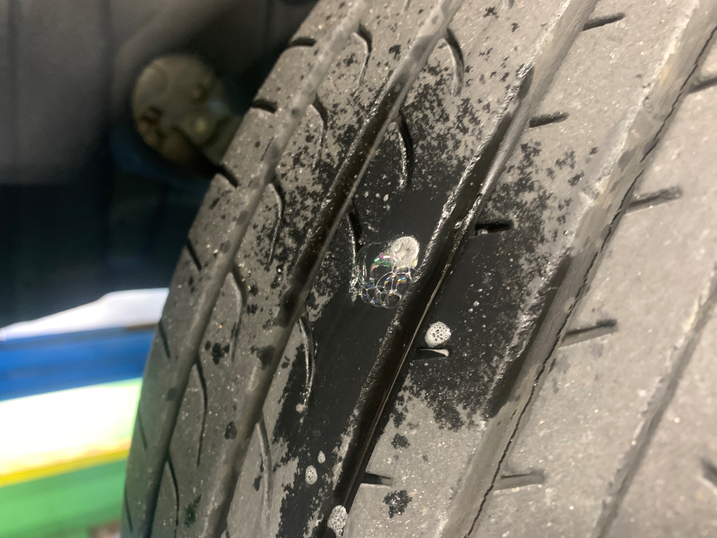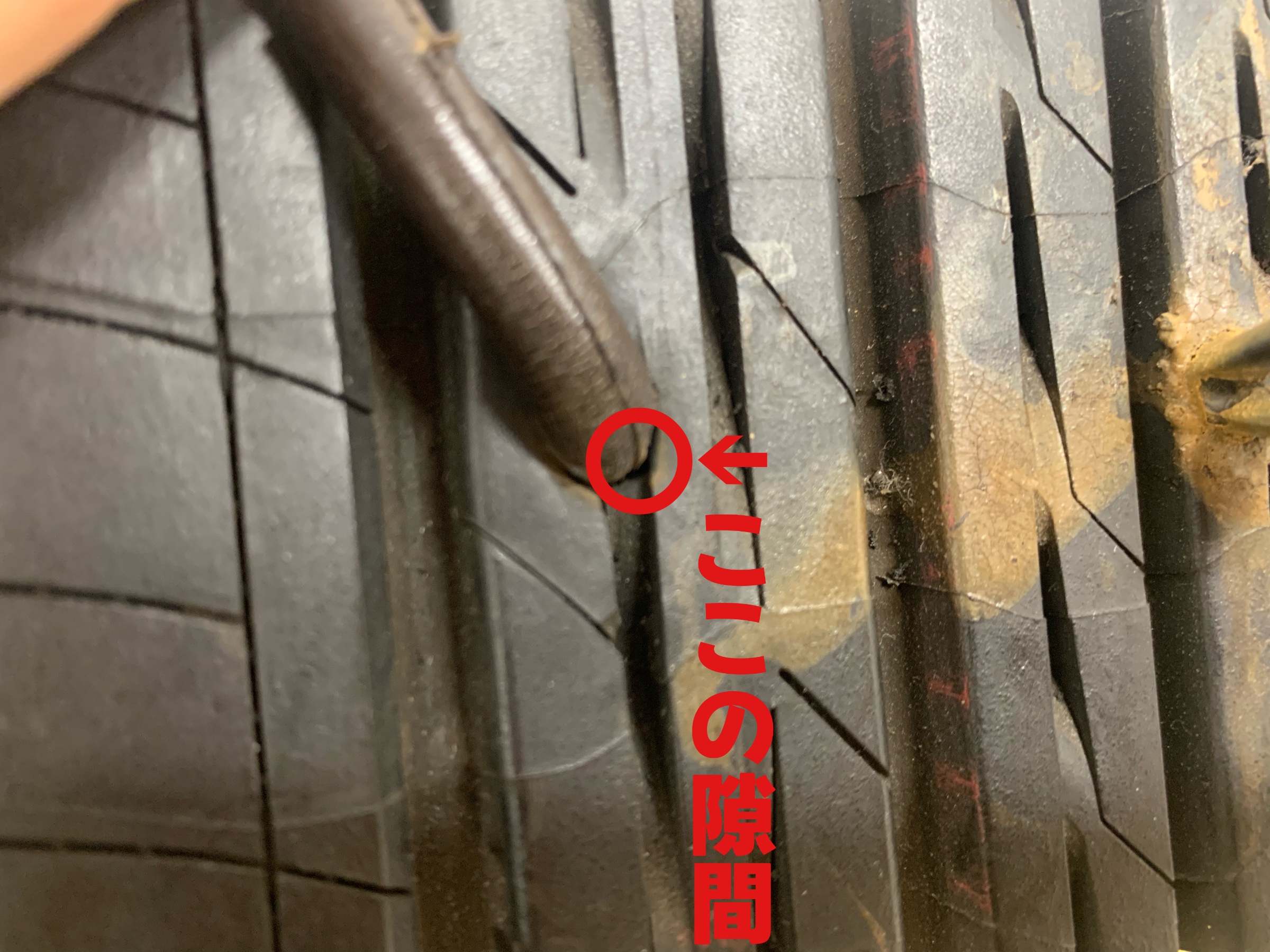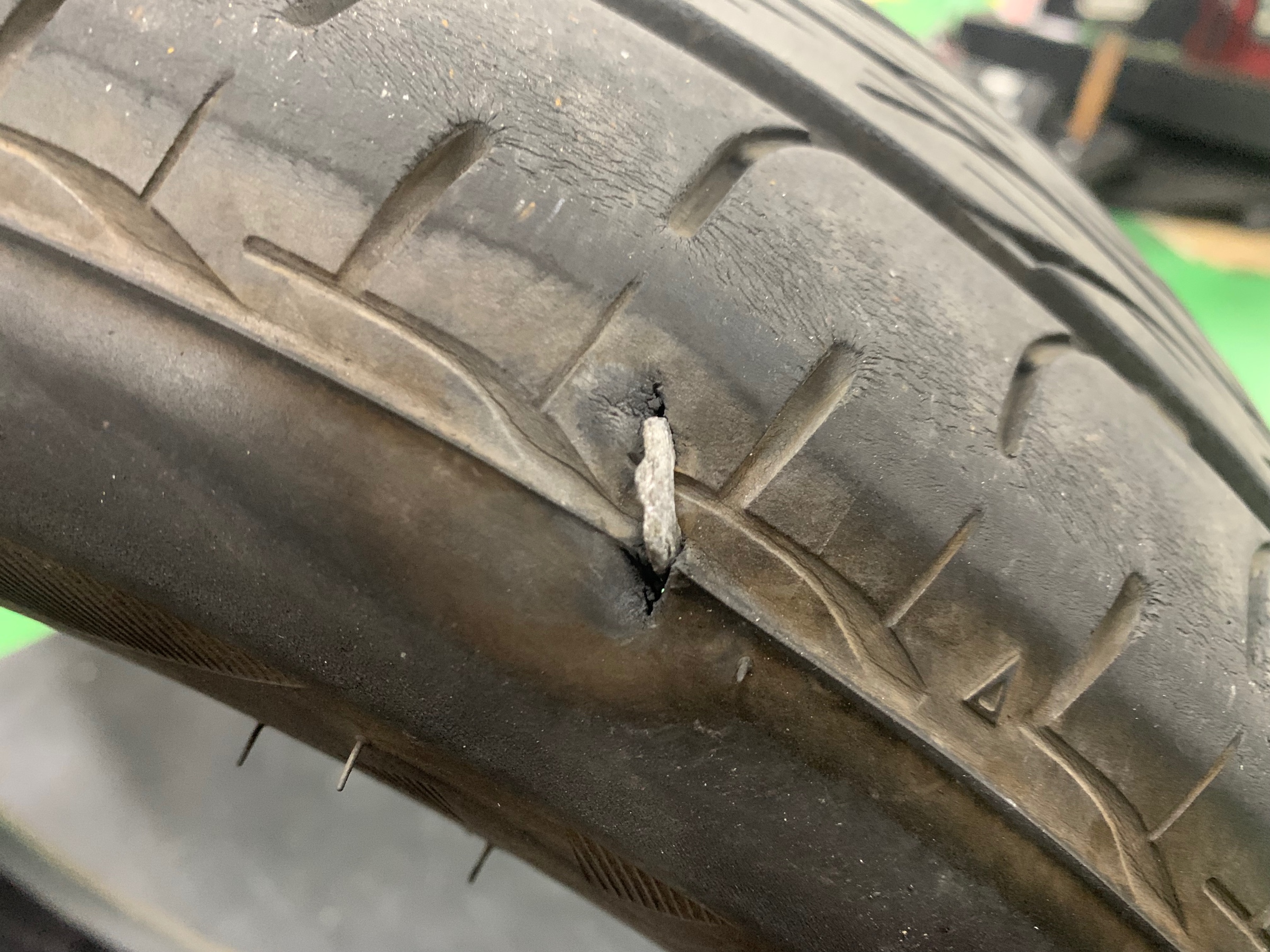 ↑タイヤのサイド面に鋭利な物が刺さっています