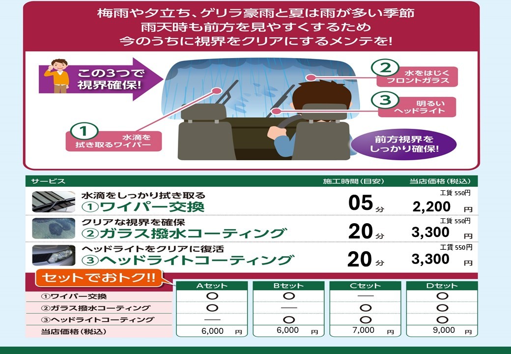 梅雨前に視界をクリアにするメンテナンスをおすすめします。