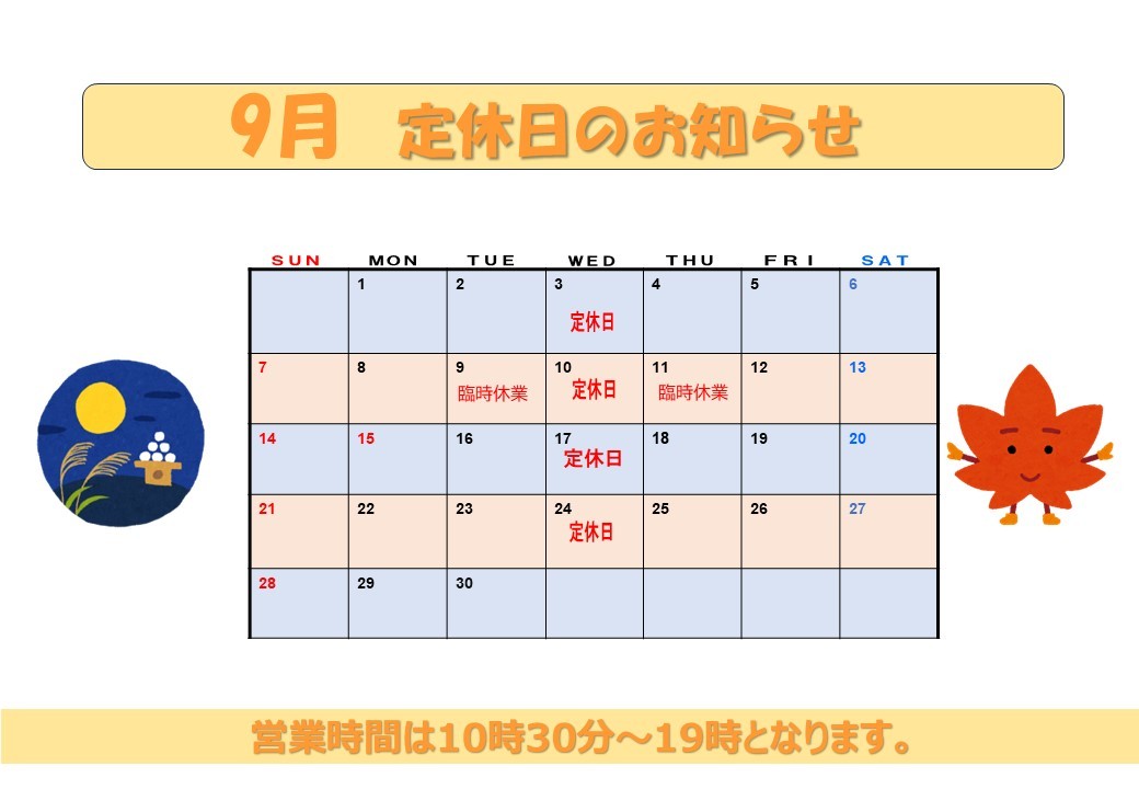 ■ 2025年9月の定休日・臨時休業日