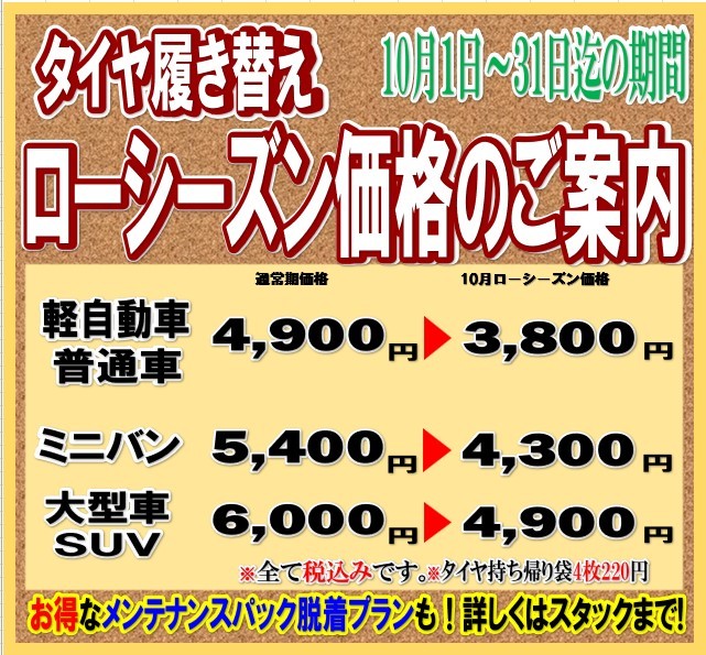 冬のタイヤ履き替えシーズンが近づいてきました。タイヤ館長岡京では、10月限定でお得な「ローシーズン価格」にてタイヤ脱着サービスをご提供いたします。