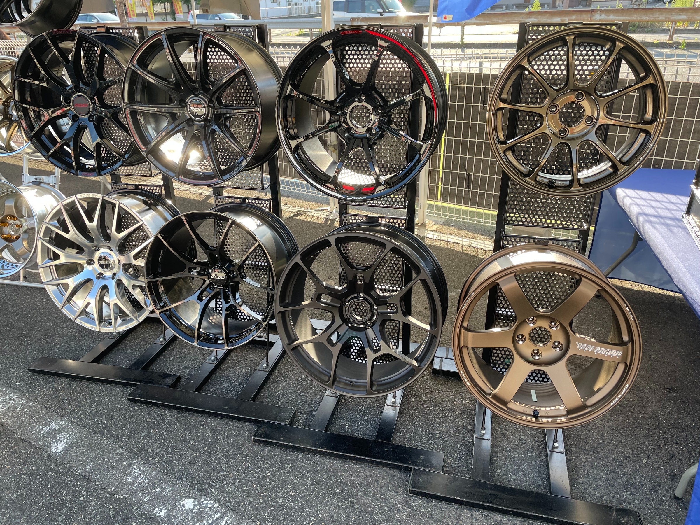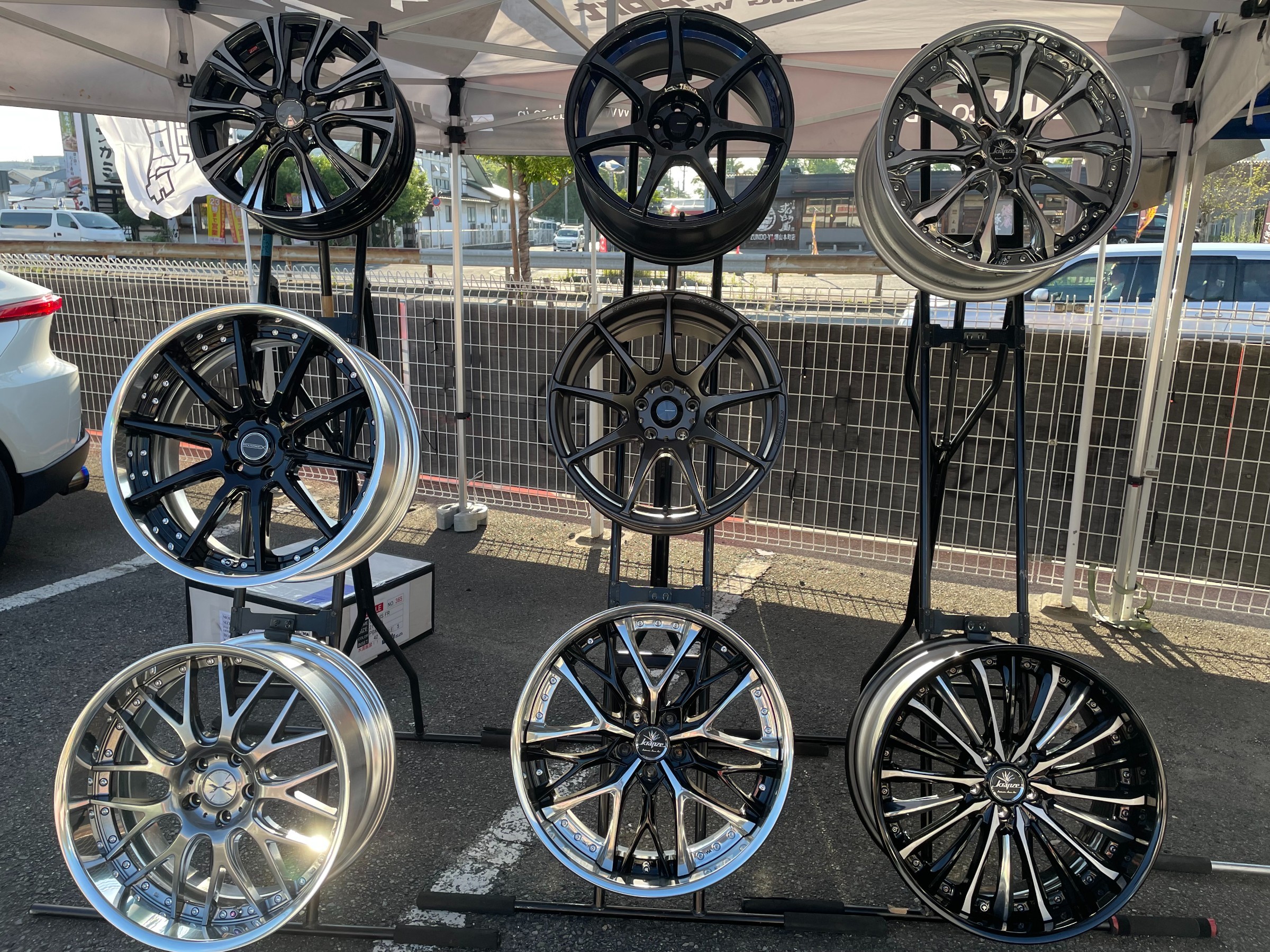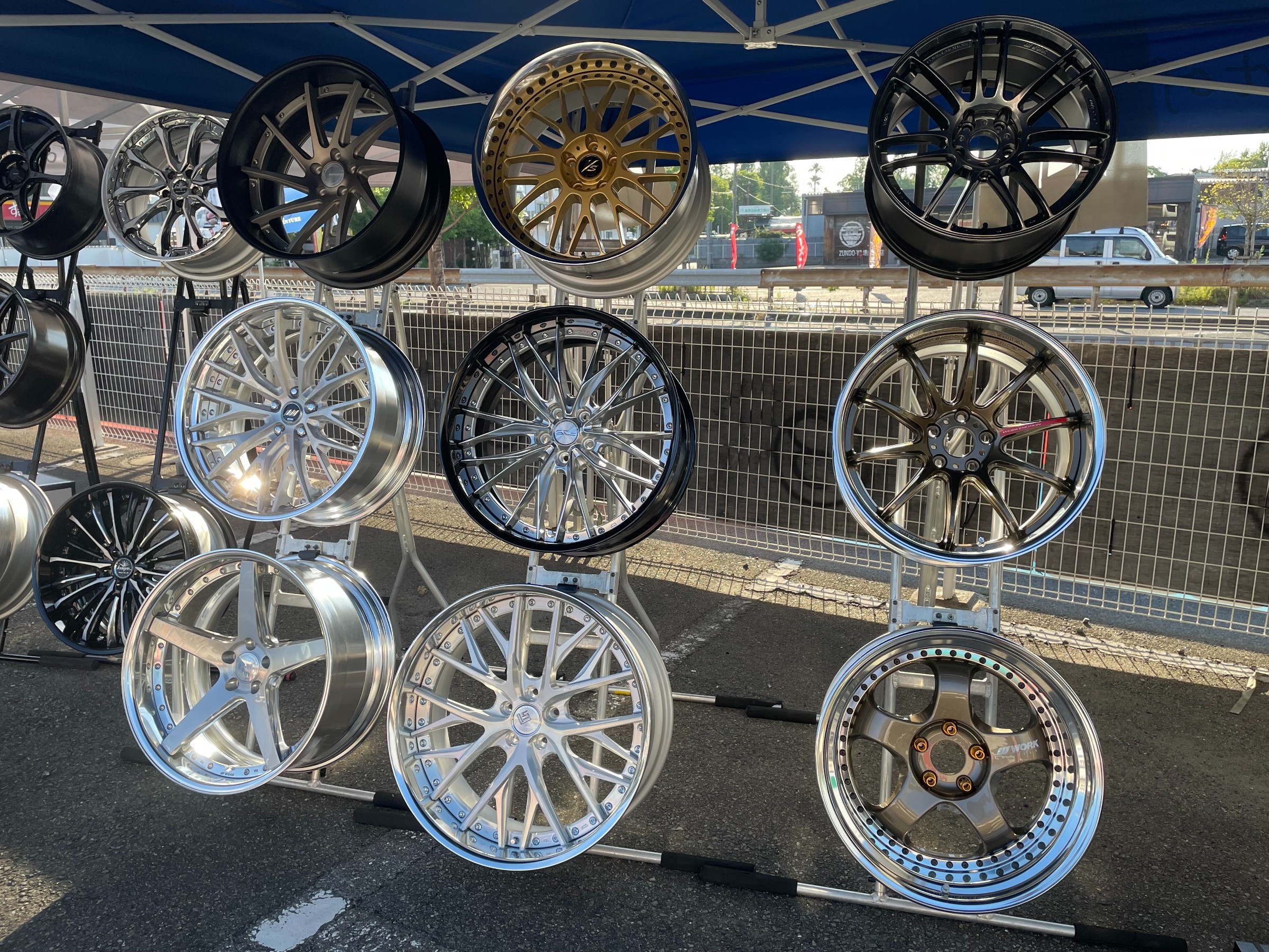 WORK、RAYS、BBS、WEDS、ENKEI、TWS、MIDなど、国内外の有名ホイールブランドを多数展示。