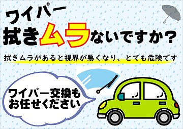 いつもタイヤ館長岡京HPご覧いただきありがとうございます(^^♪ 突然の雨や雪で、水捌けが悪く、視界が悪くなることありますよね。 拭きムラがあったり、水捌けが悪くなっているとワイパーの交換 時期です。 タイヤ館長岡京では、ワイパーの取り扱いありますので、 ぜひご来店ください(^_^)/ お車の...
