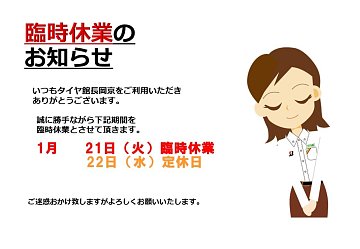 いつもタイヤ館長岡京HPご覧いただきありがとうございます(^^♪ 臨時休業のお知らせです なお、23日(木)より通常営業致します。 ご迷惑をお掛け致しますが、 ご来店の際はご注意ください。