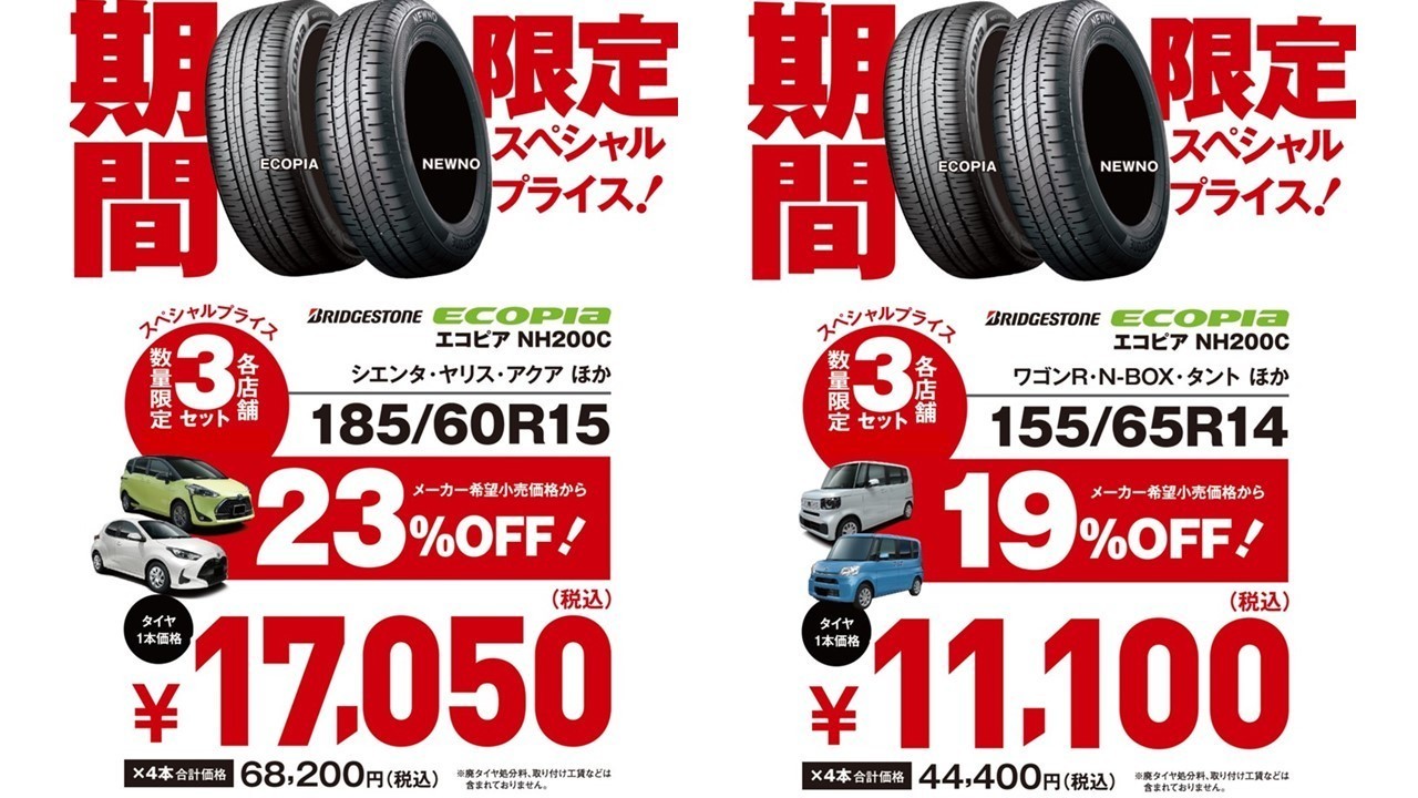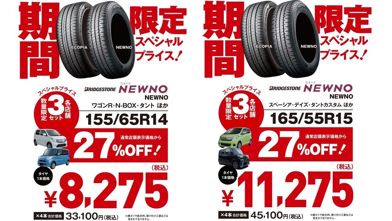 ブリヂストンタイヤを『今だけ』数量限定スペシャルプライスでご提供! 【期間】9月20日(金)~10月20日(日) ■ブリヂストン NEWNO 最大27%OFF! ※通常店頭表示価格より ★155/65R14 タント、N-BOX、ワゴンR、デイズ、ムーヴ、デイズ など ★165/55R15 スペーシア、タントカスタム、デイズ、デリカミ...