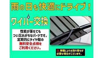 こんにちは!タイヤ館 長岡京店のかねきです! 梅雨明けは間近でありながら夏季はゲリラ豪雨にも悩まされる時期ですね。 運転中に突然の雨に襲われ、視界不良になった経験はございませんか? タイヤ館ではワイパーもお取り扱いしています! “無料点検”も行っています! ※一部メーカー 社外品はお取...