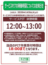 いつも当店をご利用いただき、誠にありがとうございます。 このたび、2026年1月5日より、 ピットの休憩時間を新たに設けさせていただきます。 当店のピット休憩時間 12:00~13:00 ◆休憩時間中は、ピット作業を一時的にストップさせていただきます。 ◆休憩時間をまたぐ作業につきましては、休憩時...