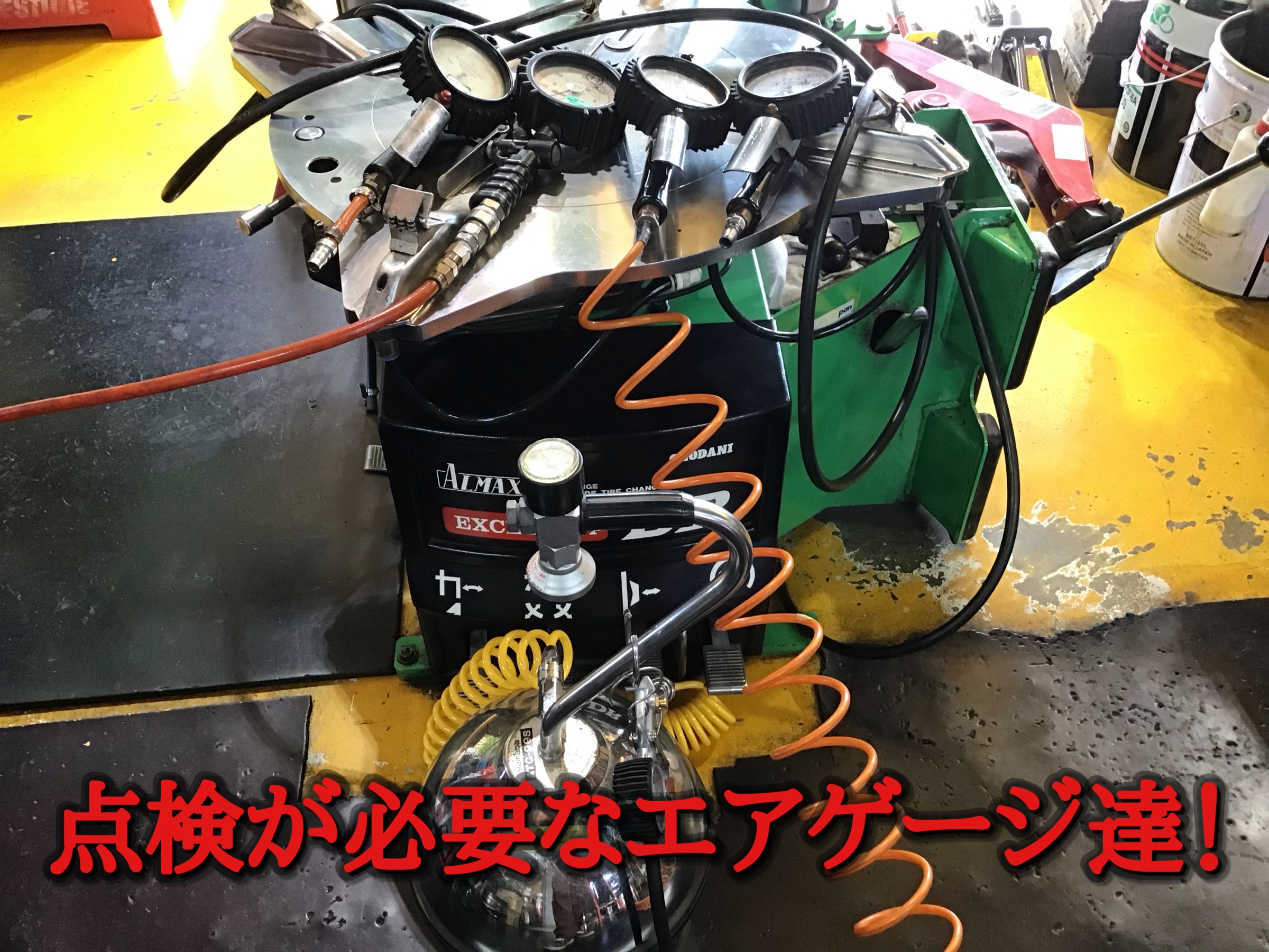 はじめに、タイヤチェンジャーの充填空気圧が適正か点検。マスターゲージで適正表示をしていたエアゲージにて空気圧充填したタイヤを使い確認します