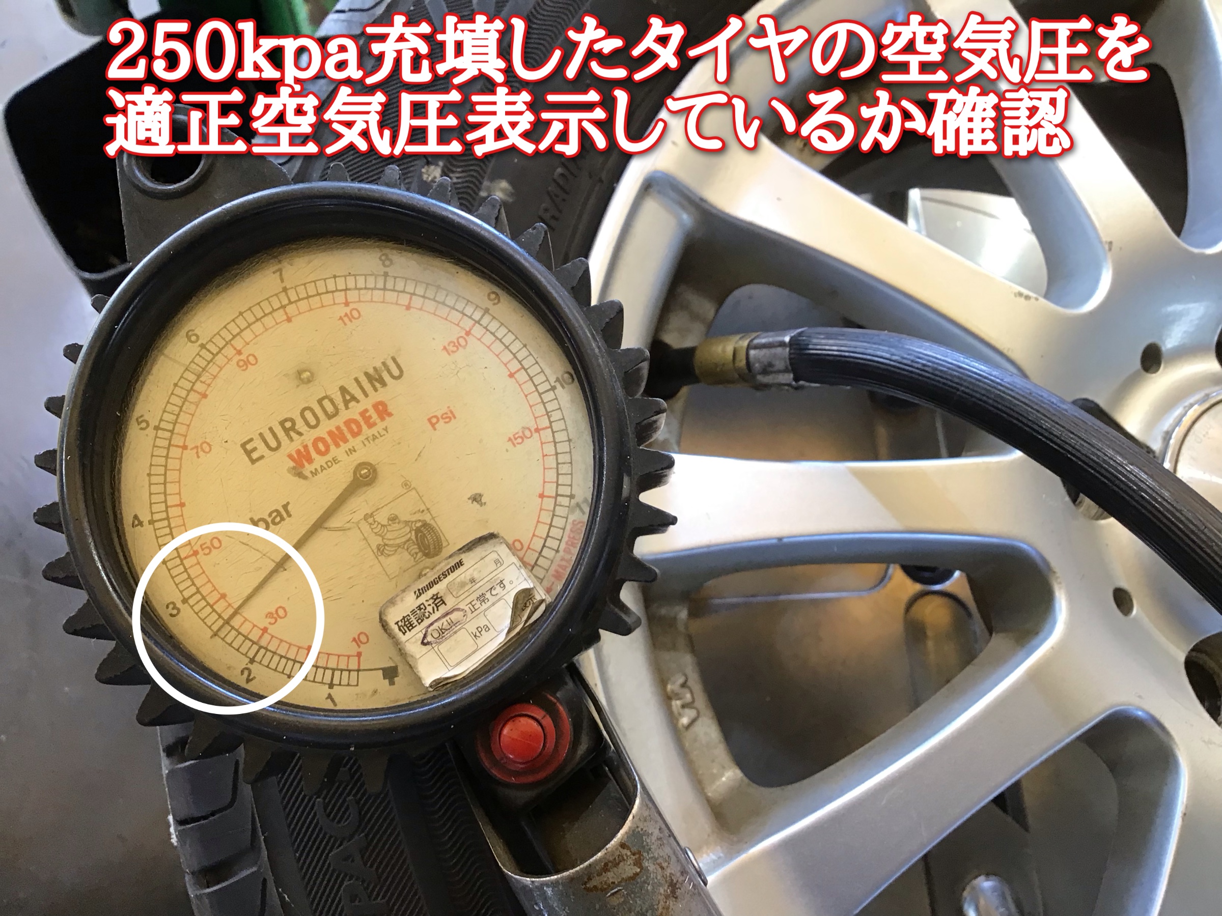 使用して点検しました。マスターゲージにて、200kpa、250kpa、300kpaと3パターンで適正か確認して行きます!