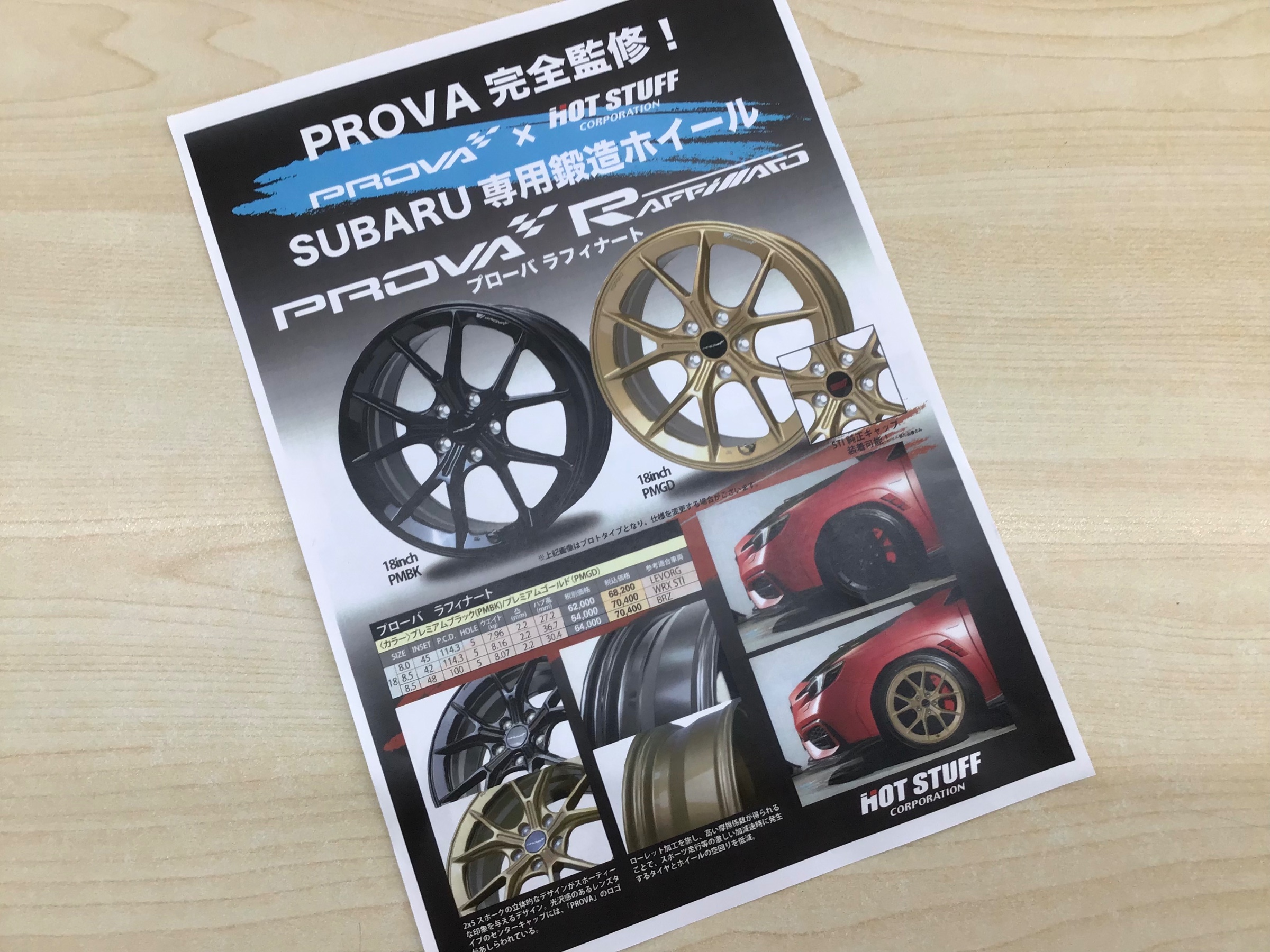 今回はスバル車専用になりますが、鍛造アルミホール【プローバ ラフィナート】サンプルを業者様より紹介いただいたので…………パンフレットと写真を載せたいと思います。