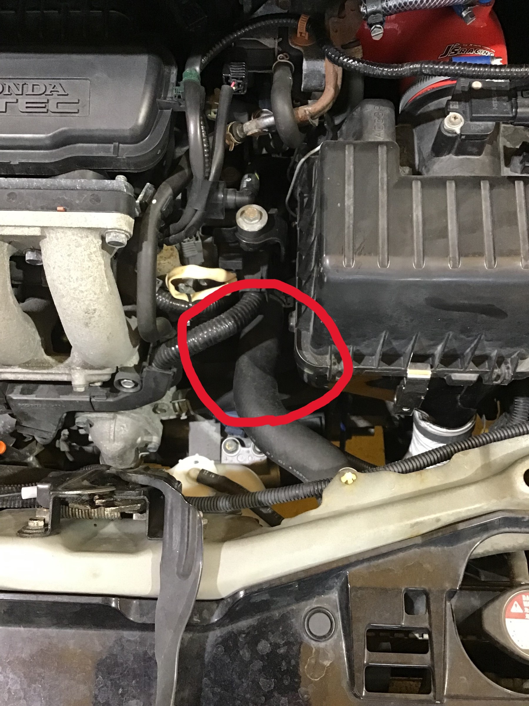 まずは水温センサーを取り付けるためにアッパー側のクーラントホース(赤丸部分)を切ります。