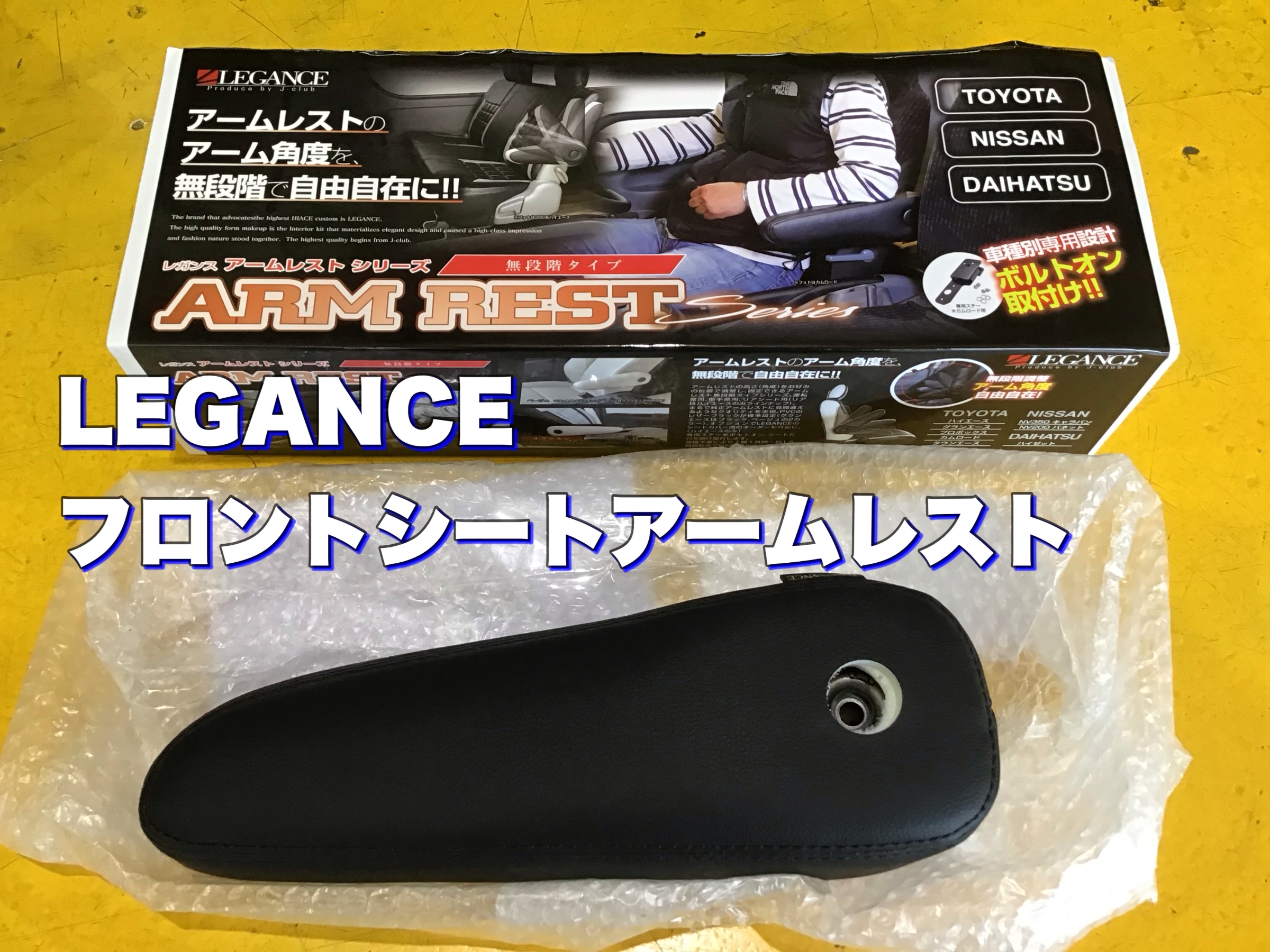 取付商品はLEGANCE(レガンス) フロントシートアームレスト 無段階タイプ取付は助手席シートに取付します。