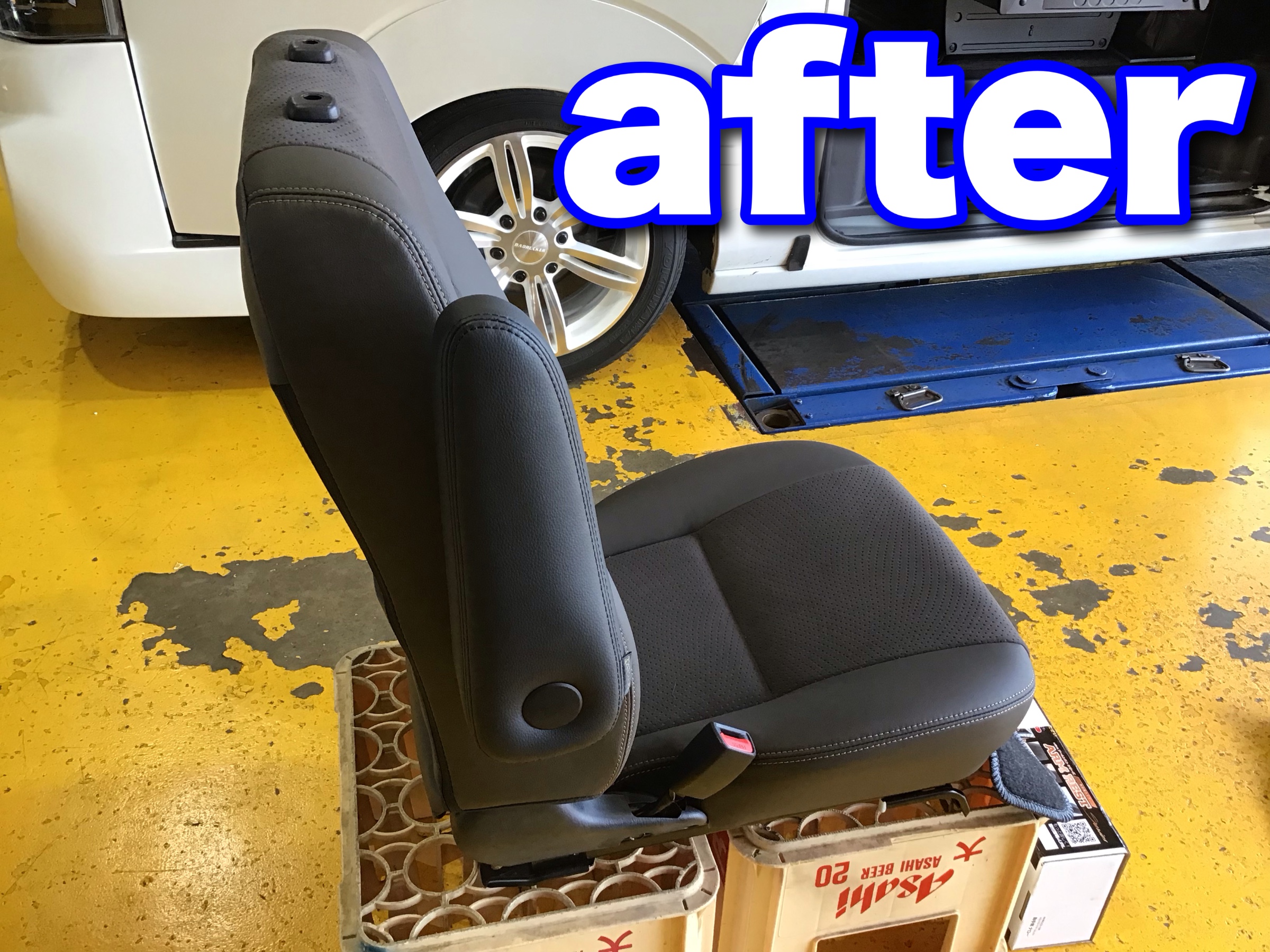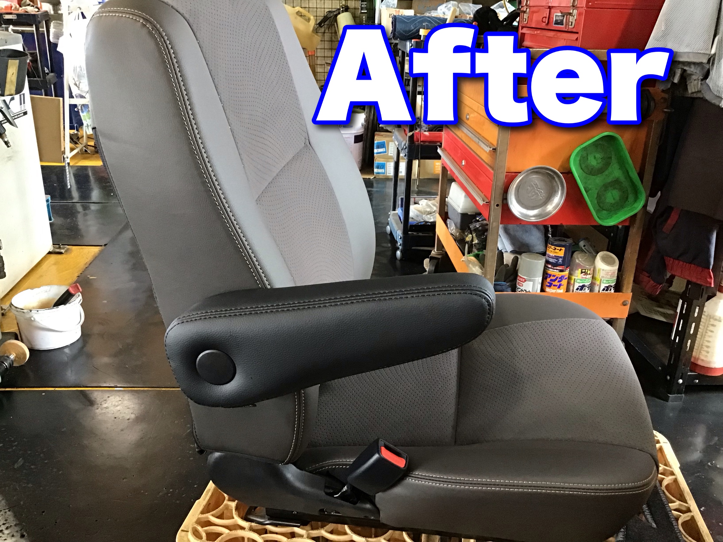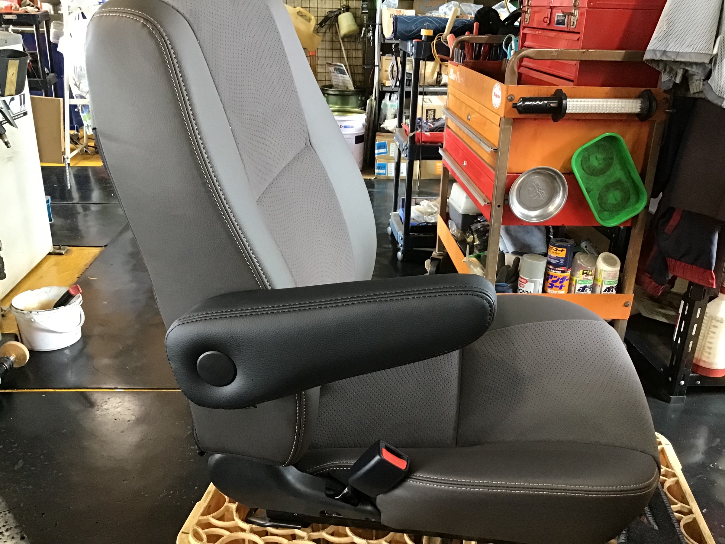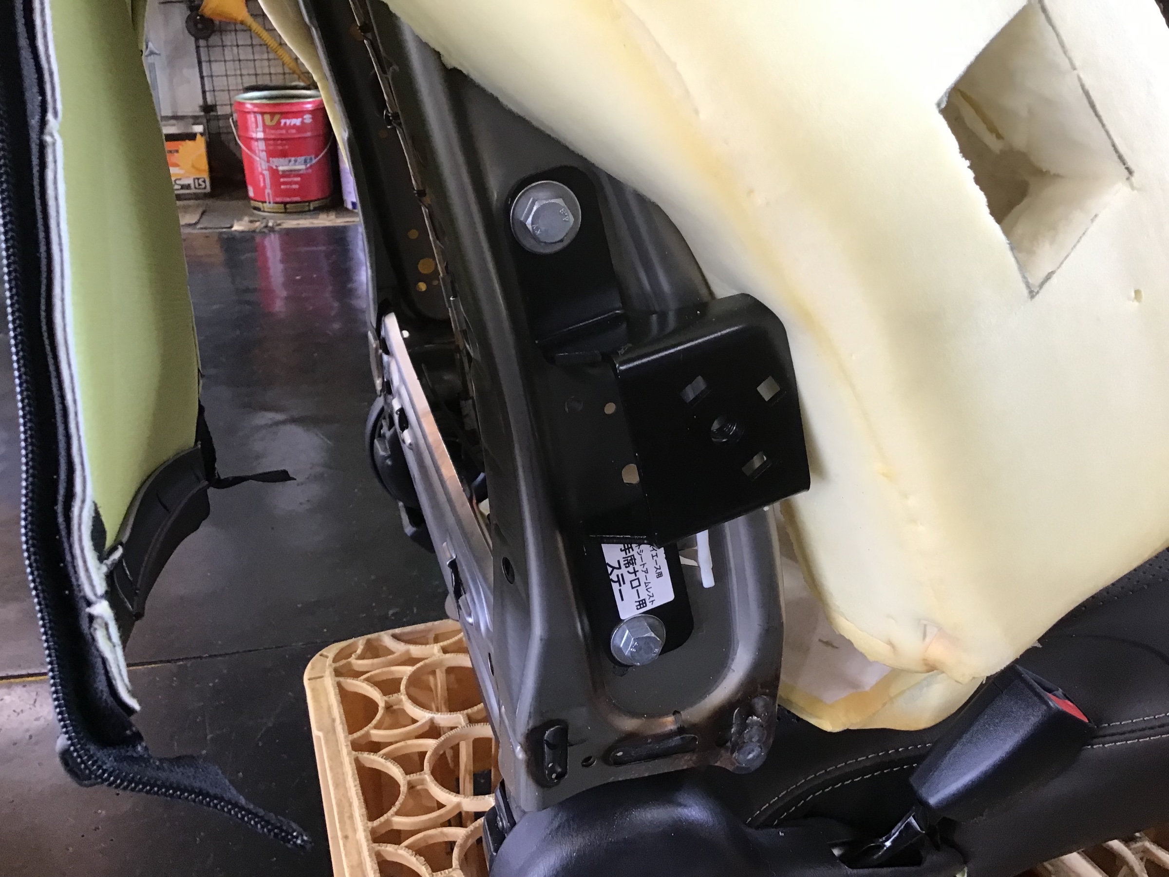 今回の取付作業事例、200系ハイエースの純正シートに社外アームレストを取付しました。