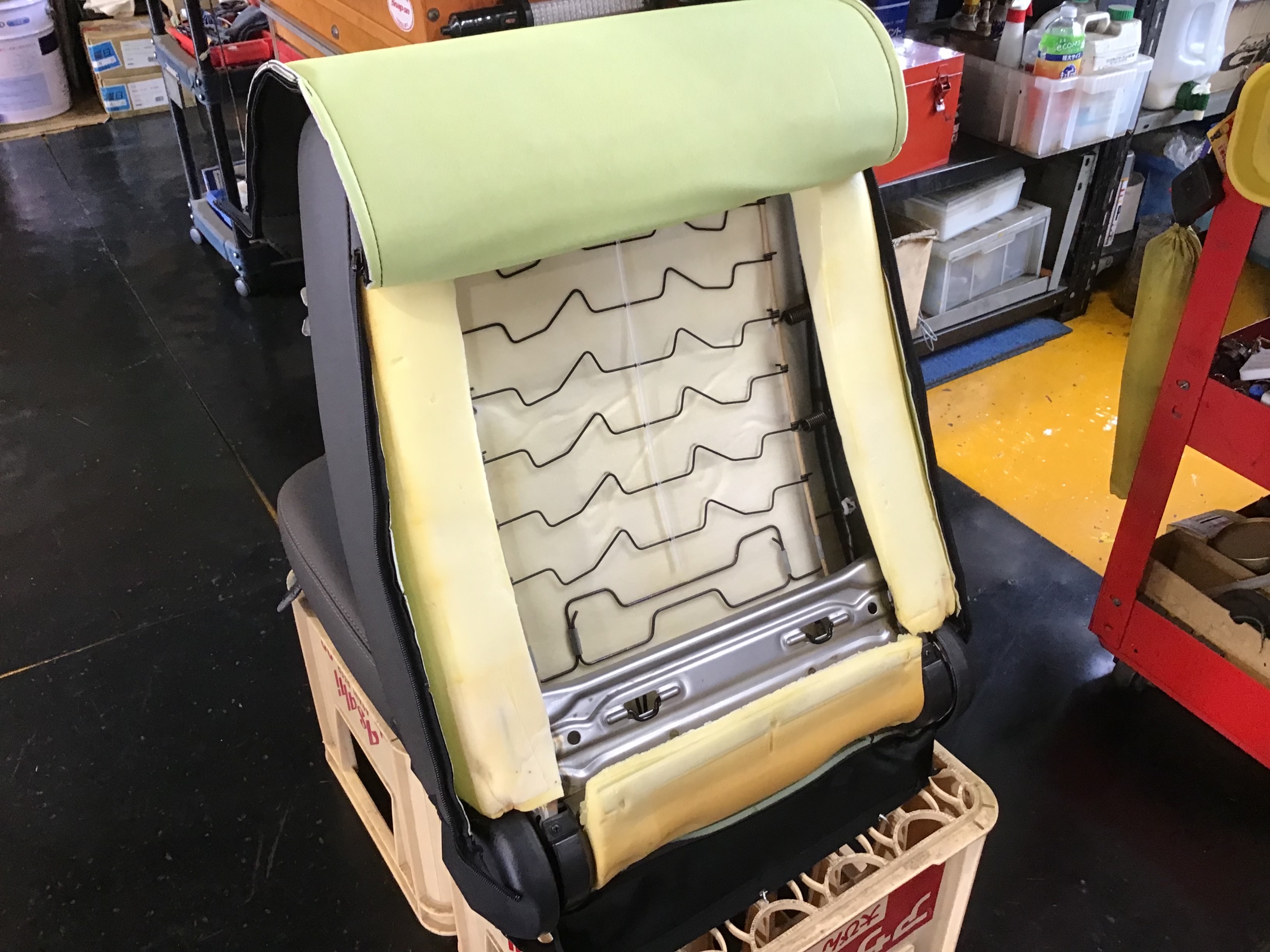 先ずはシートを取り外します〜続いて………アームレストを取付するためのステー取付になりますが、シートの生地をまくる