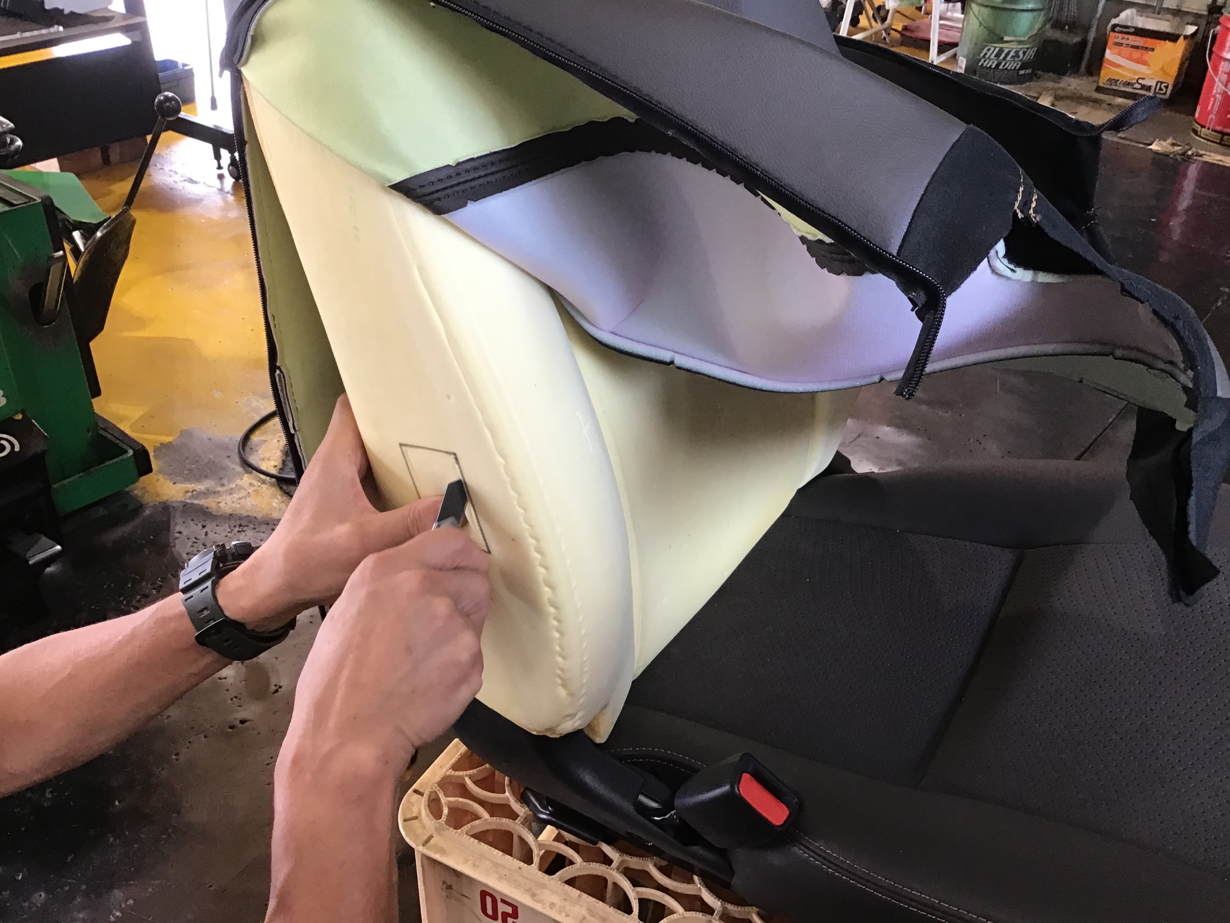 作業になりますよ〜シート裏下側の金具をペンチなどで広げて取り外して行きます。サイドウレタンに型紙を使用してステーの取付を行う!