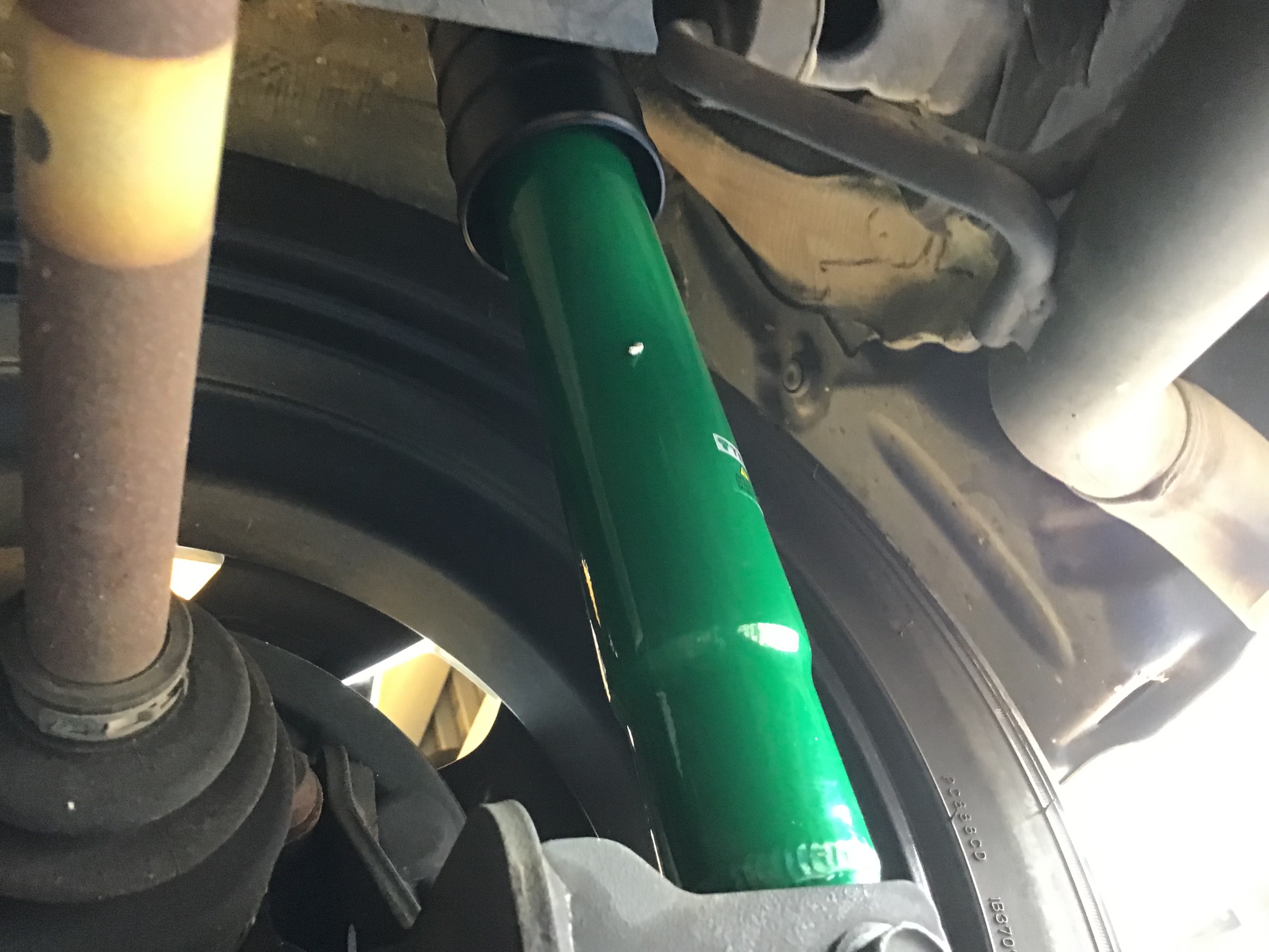 純正形状ショックアブソーバータイプのテイン EnduraPro PLUSを交換取付しました。取付完了画像 撮影アングルが少し変ですが………交換後はこんな感じです