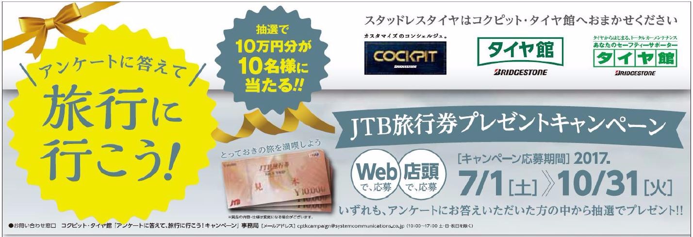 タイヤ館では、7月より『JTB旅行券プレゼントキャンペーン』スタート!!