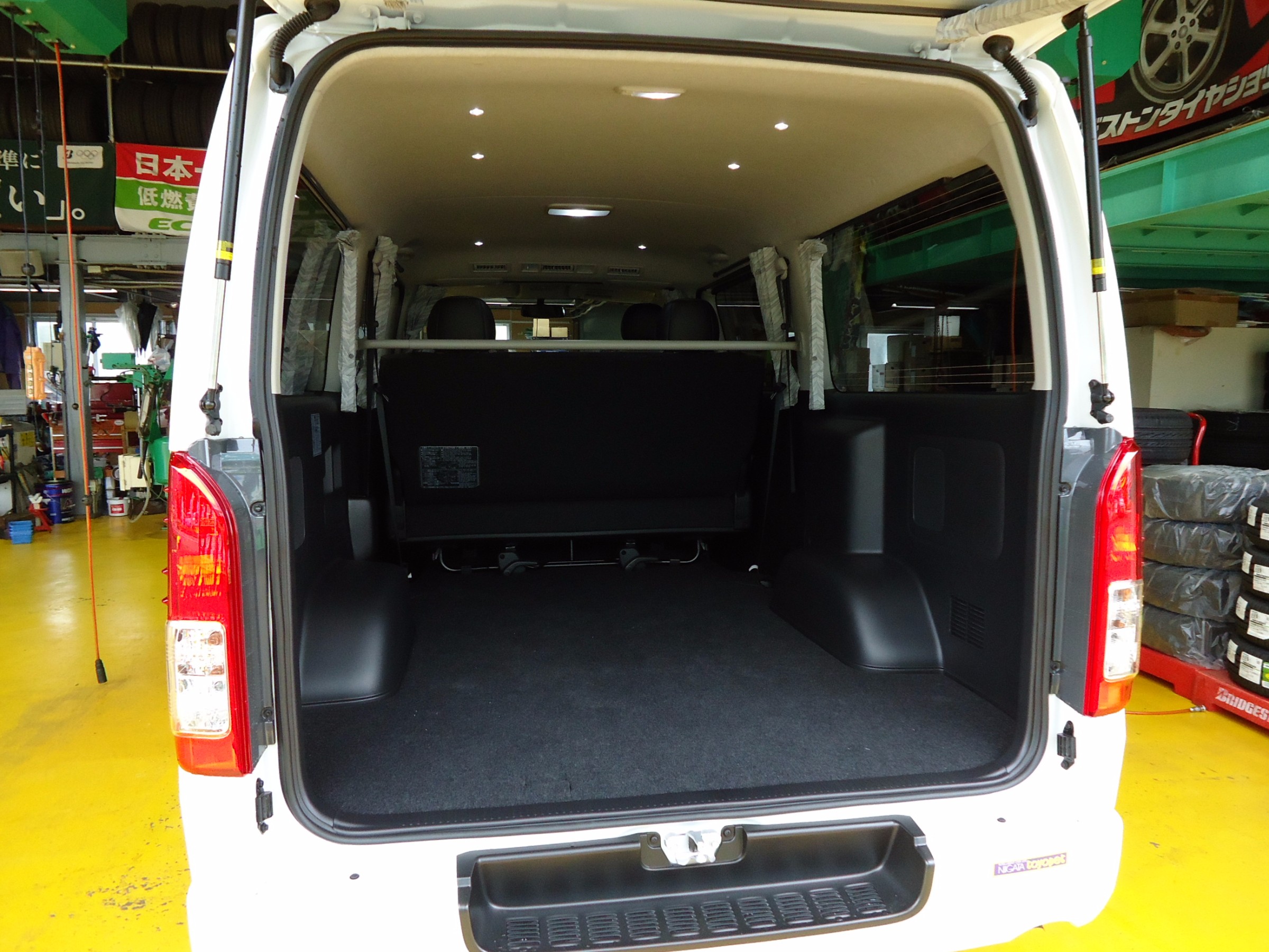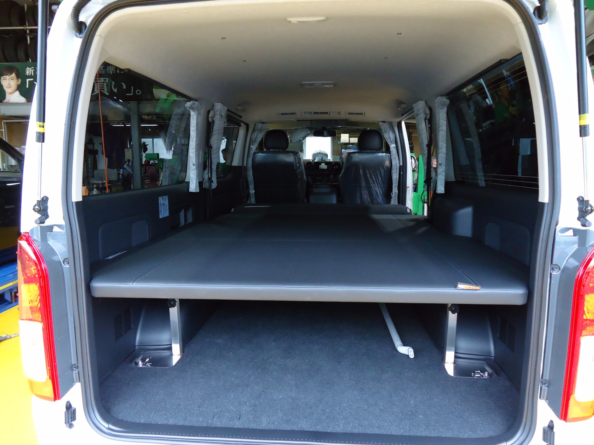 新車ハイエース(KDH206V)ローダウンと荷物室ベットキット取付紹介です。