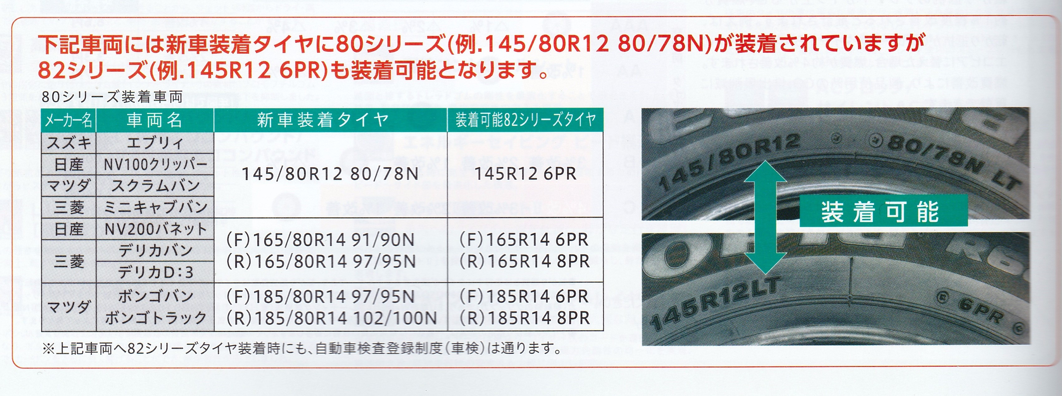 最近の新車装着商用車タイヤの一部車種に80シリーズ(例145/80R12 80/78N)が