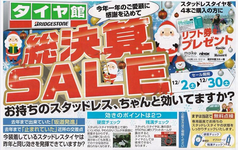 タイヤ館では、今年一年のご愛顧に感謝を込めて「総決算SALE」を開催いたします。