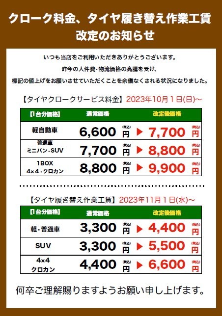 タイヤクローク・タイヤ作業料金・タイヤ履き替え作業工賃の価格改定のおしらせ