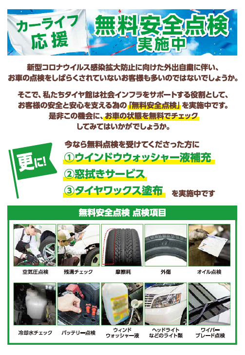 安全点検☆実施中 ポスト 2020年6月25日 安全点検実施中 梅雨のお天気が戻ってきましたね>< 雨の日の運転はいつもより慎重に運転が必要ですよね~☆ クルマの点検をしっかりしておくことで 安心安全な運転ができますよ^^ 安全点検は無料です^^ 今なら無料点検を受けてくださった方に ①ウインドウウォッシャー液補充 ②窓ふきサービス ③タイヤワックス塗布 しております^^bお気軽にご来店ください(^O^)/ 担当:なかずみ
