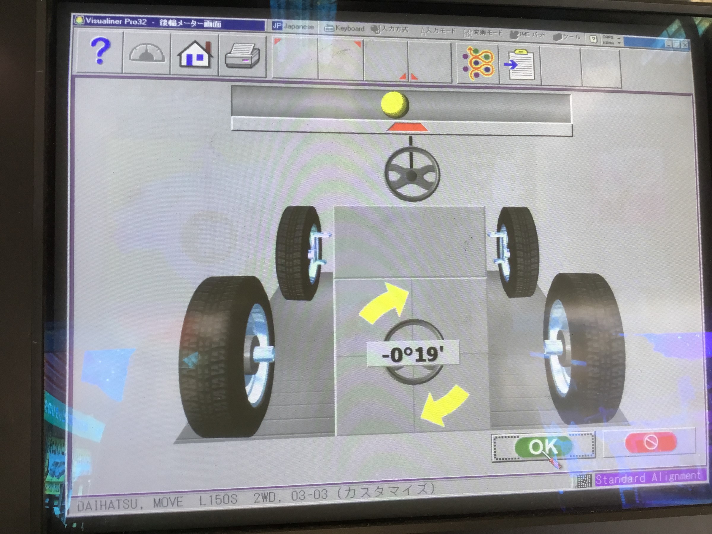 作業前の商談で車体が左へ流れている感覚があるとおっしゃられて、まずは測定してみると…