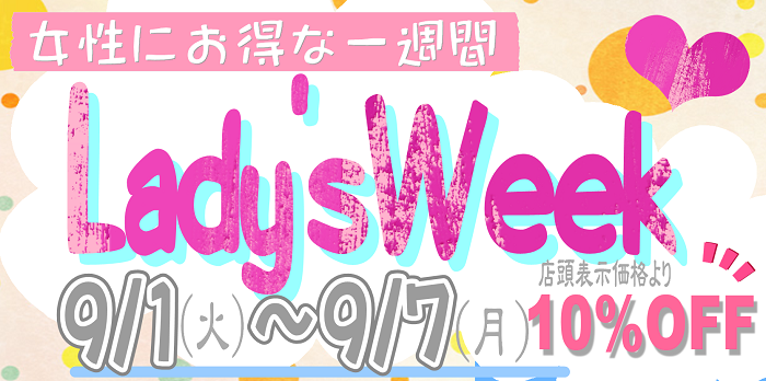 レディースウィーク☆9/1(火)~9/7(月) ポスト 2020年8月30日 【レディースウィーク】 を開催します! ◇◇期間は9月1日(火)~9月7日(月)◇◇ 女性の方、女性と一緒にご来店の方にお得な1週間です。 メンテナンス用品が通常価格から10%OFF また、タイヤ購入いただいたお客様にプレゼント! タイヤのお問い合わせ、お見積りも大歓迎です(^^) おでかけ前のタイヤ点検でもお待ちしておりますよ♪ 担当:なかずみ